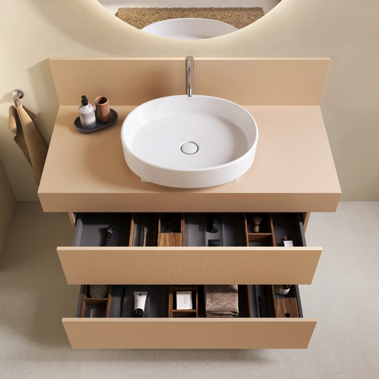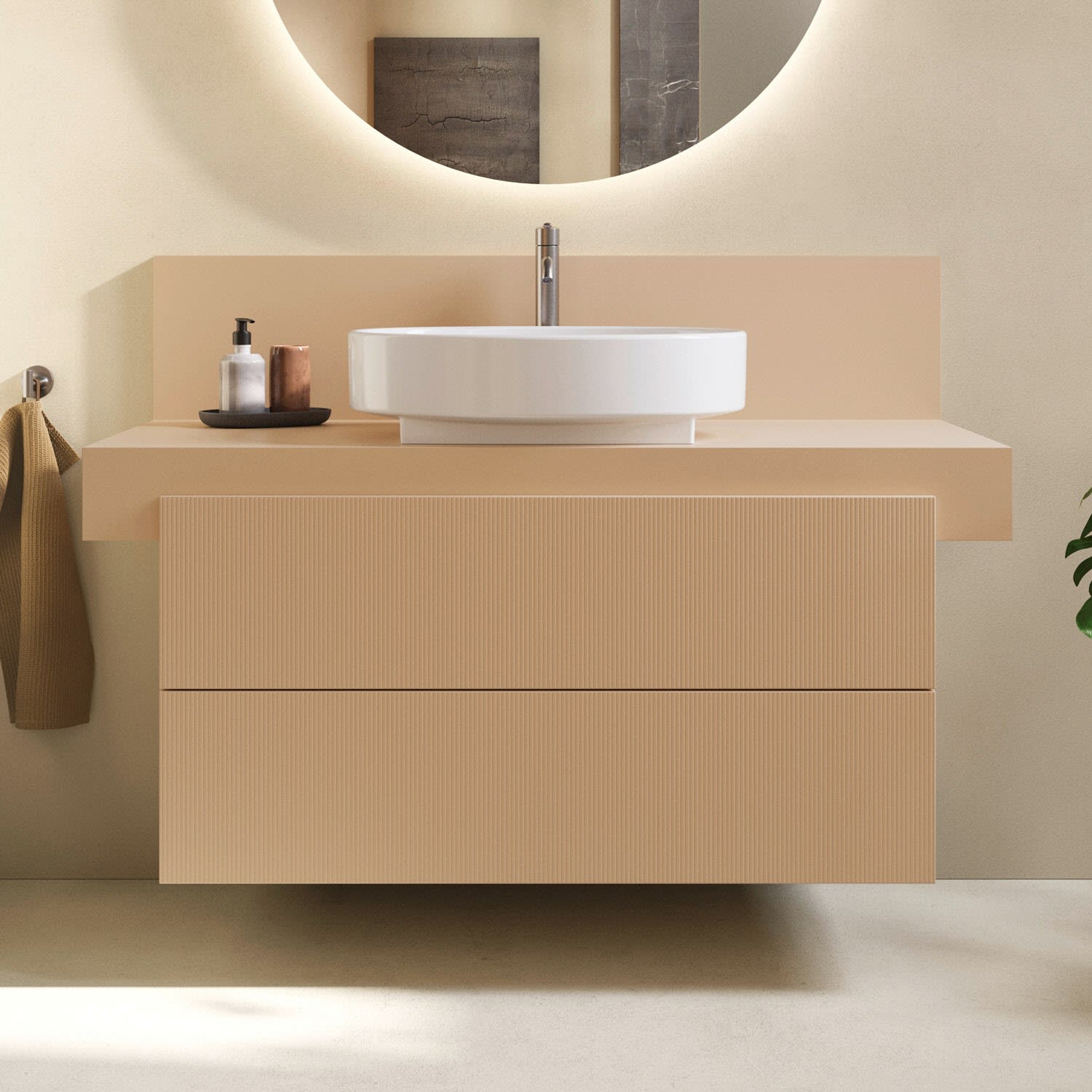 Ein passender Aufsatzwaschtisch ist nicht im Lieferumfang enthalten und muss separat bestellt werden. Bitte bei der Bestellung die Artikelnummer der gewünschten Keramik angeben. Bei einer Fremdkeramik können gegebenenfalls zusätzliche Kosten für den passenden Ausschnitt entstehen.