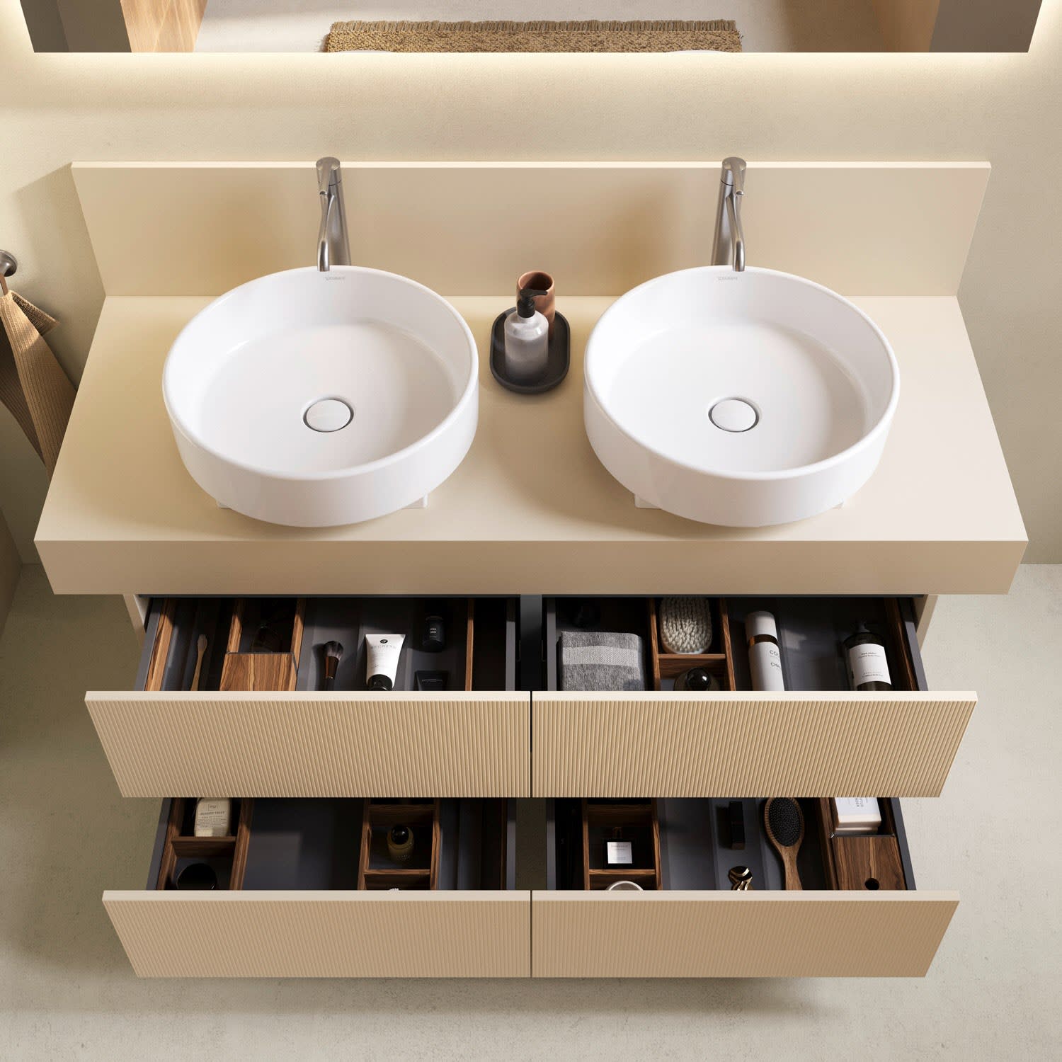 Die passenden Aufsatzwaschtische sind nicht im Lieferumfang enthalten und müssen separat bestellt werden. Bitte bei der Bestellung die Artikelnummer der gewünschten Keramik angeben. Bei einer Fremdkeramik können gegebenenfalls zusätzliche Kosten für den passenden Ausschnitt entstehen.