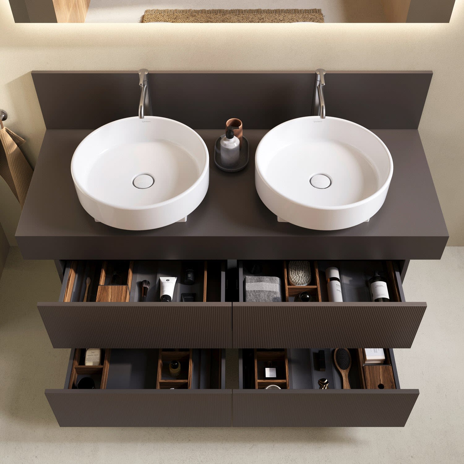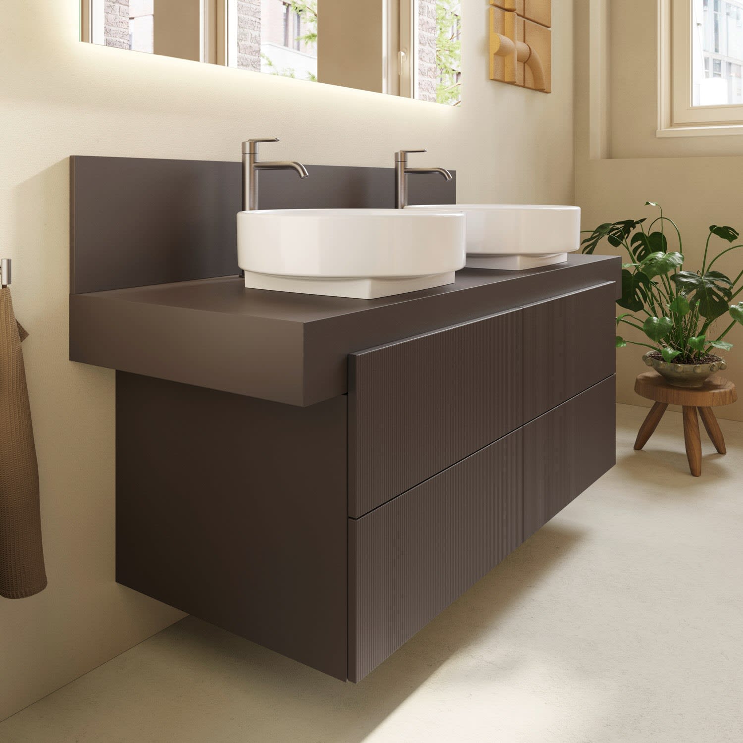 Die passenden Aufsatzwaschtische sind nicht im Lieferumfang enthalten und müssen separat bestellt werden. Bitte bei der Bestellung die Artikelnummer der gewünschten Keramik angeben. Bei einer Fremdkeramik können gegebenenfalls zusätzliche Kosten für den passenden Ausschnitt entstehen.