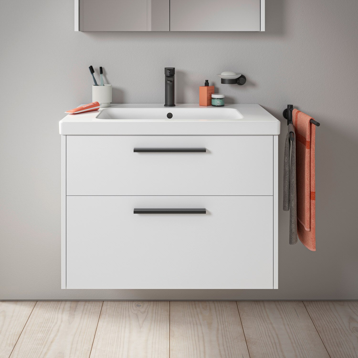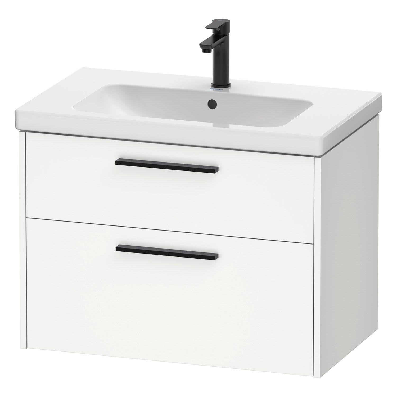 Duravit D-Code Waschtischunterschrank 80 cm mit Keramikwaschtisch, mit 2 Auszügen, Griff schwarz