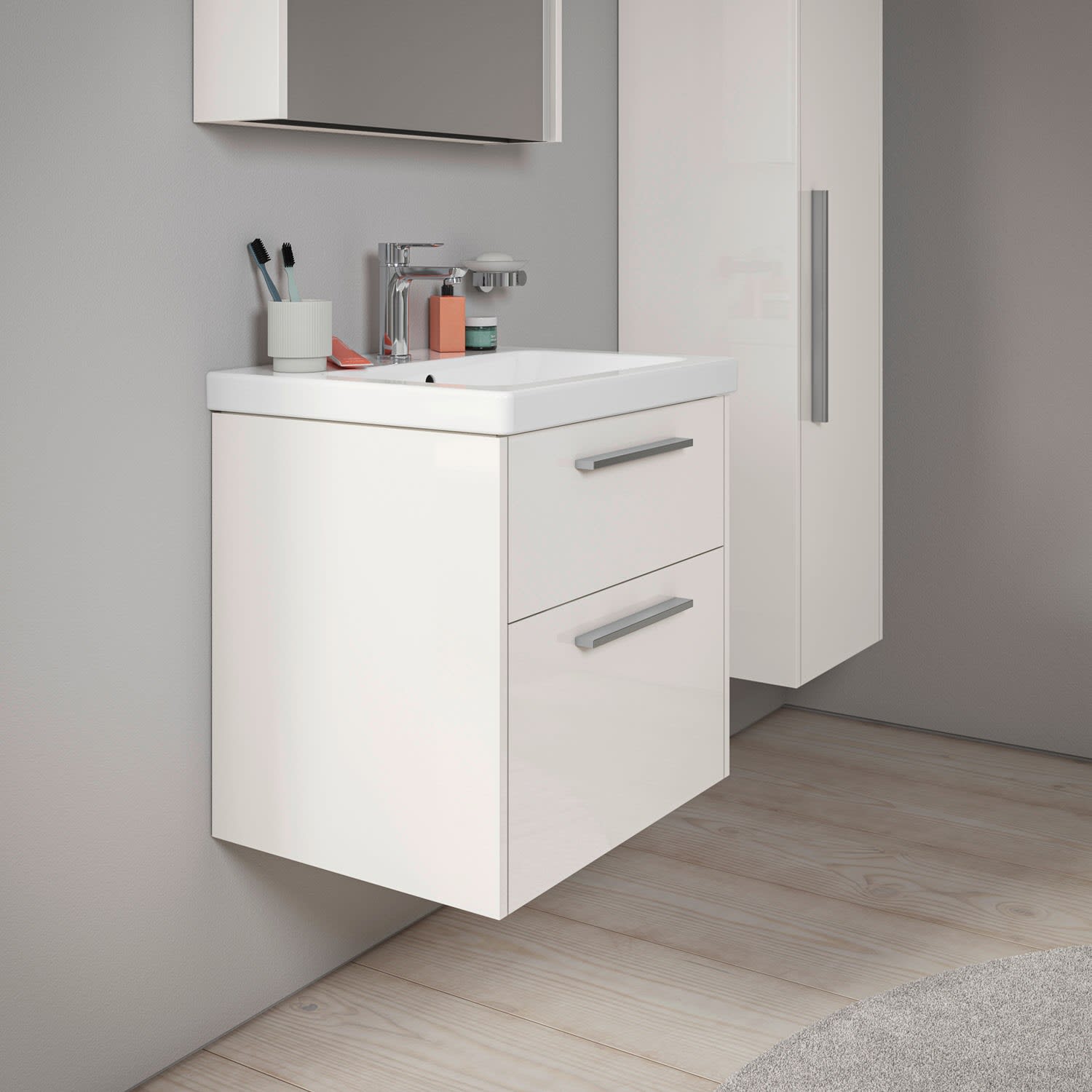 Elegante und funktionale Waschplatzlösungen in allen gängigen Abmessungen entstehen durch die Kombination der D-Code Möbelwaschtische mit diesen Unterschränken in modernen, pflegeleichten Farb- und Holzdekoren.