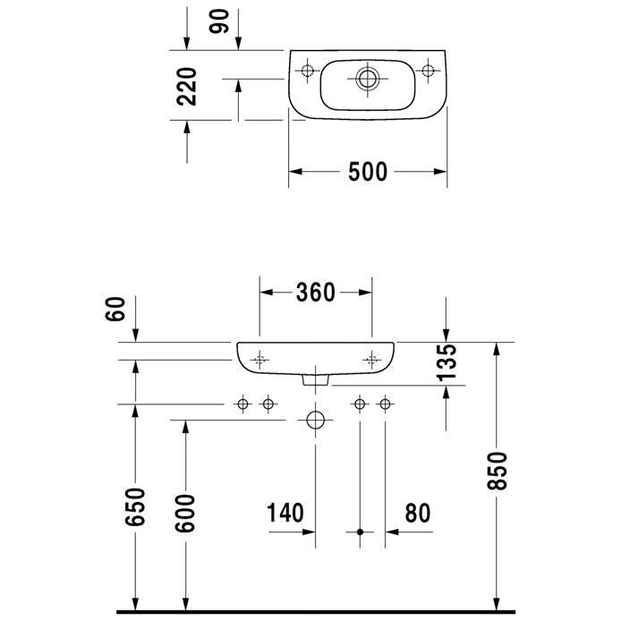 Duravit D-Code Handwaschbecken 50 cm 1 Hahnloch rechts durchgestochen
