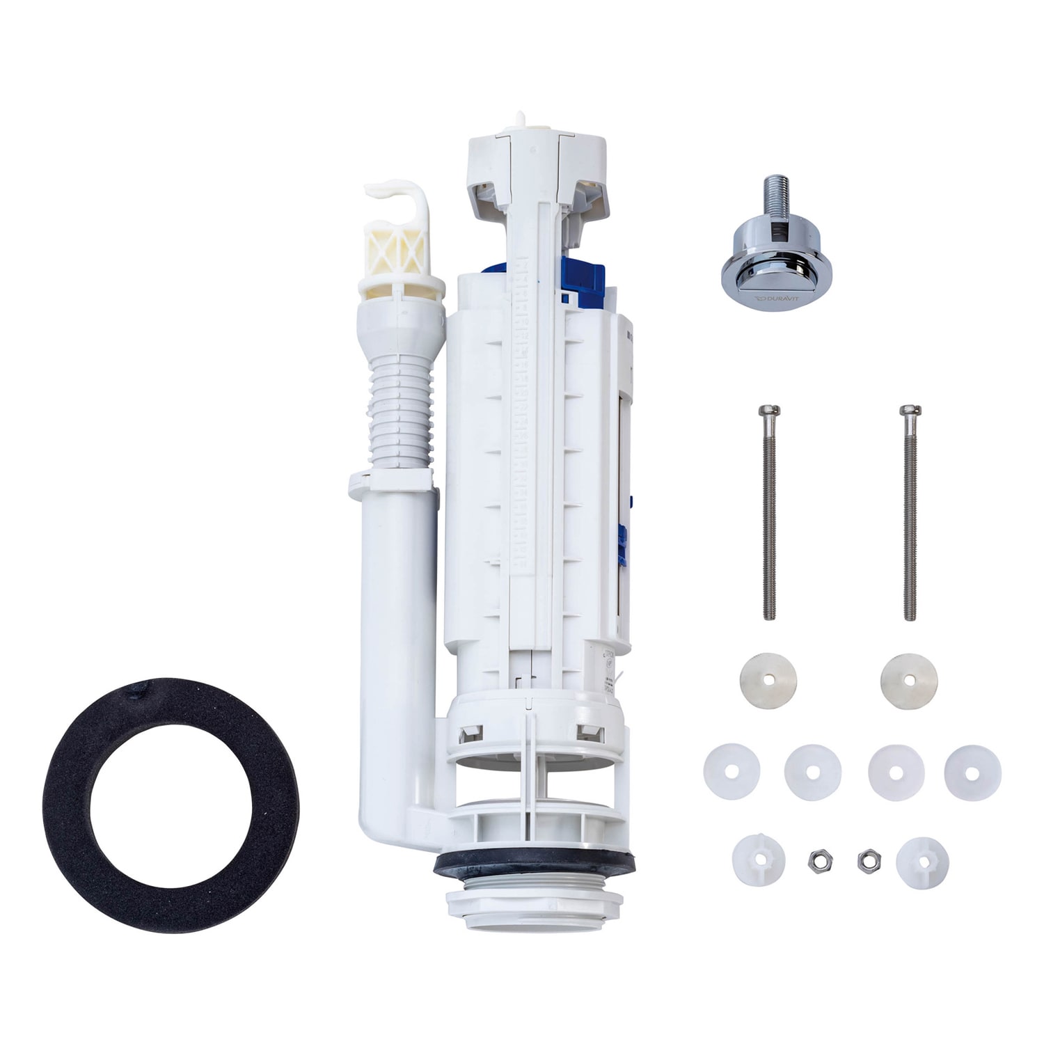- Ablaufglocke, Füllventil, Drücker und Befestigungssatz (Moosgummidichtung und Befestigungsschrauben, inkl. Dichtungen)