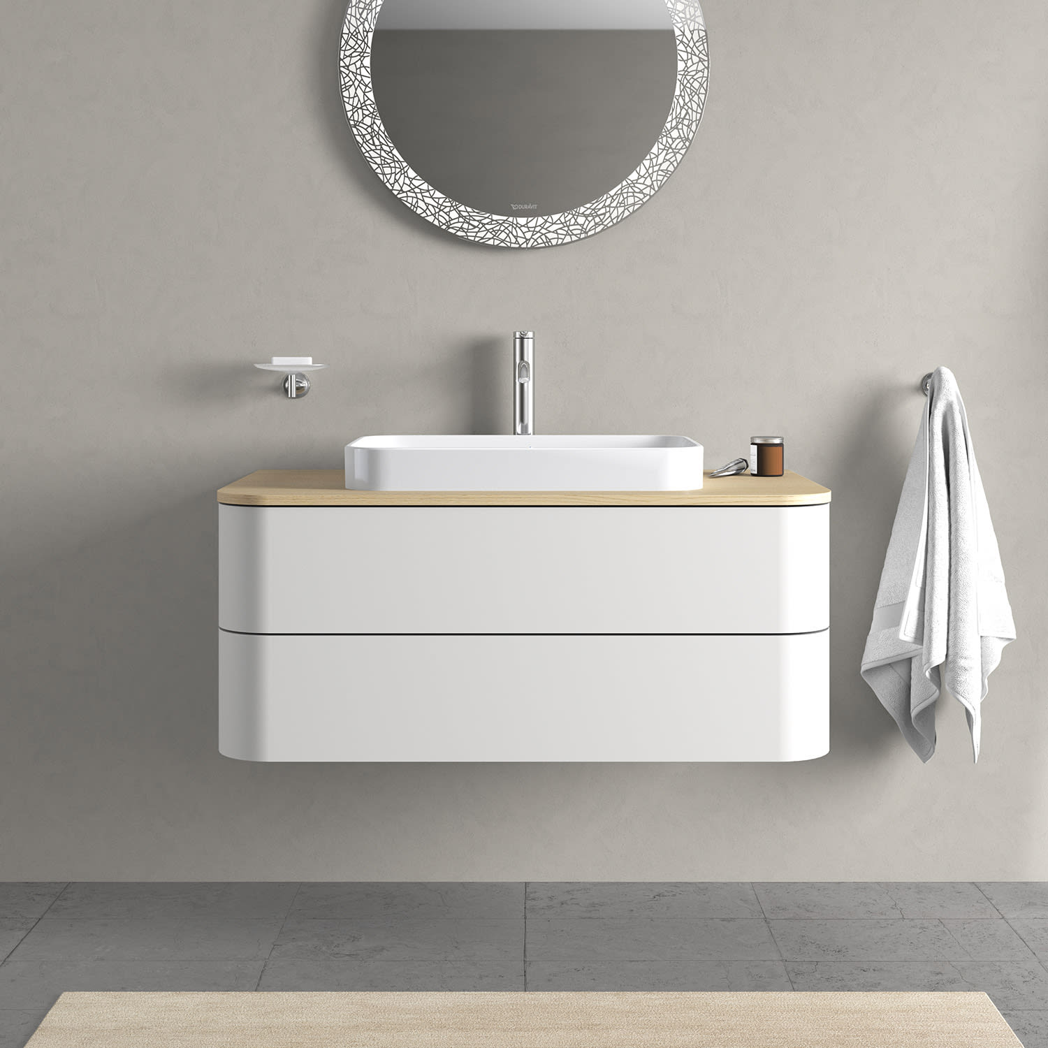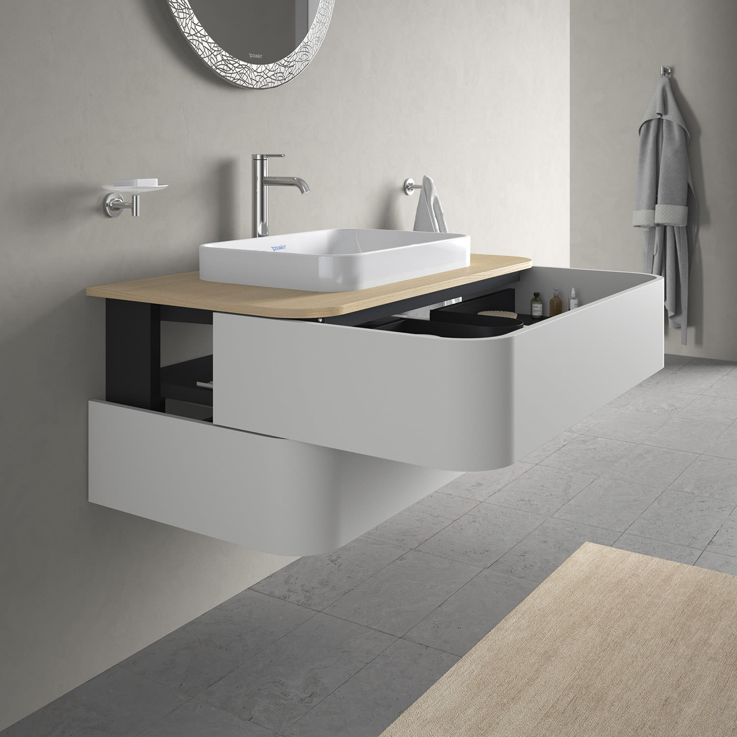 Modern und elegant präsentiert sich der wandhängende Konsolenwaschtischunterbau aus der Happy D.2 Plus Serie by sieger design. Zwei großzügige grifflose Vollauszüge mit hoher Tragfähigkeit Das unverwechselbare Design des Möbels mit seinen fein abgerundeten Ecken wird in den dazu passenden Aufsatzbecken konsequent weitergeführt. Sowohl für den Korpus wie auch für die dazu passende Konsolenplatte stehen zahlreiche Oberflächen- und Farbgestaltungen zur Auswahl – von unifarben bis raffiniert zweifarbig. Optional kann werkseitig ein cleveres Einrichtungssystem aus Massivholz sowie eine integrierte Innenbeleuchtung verbaut werden.