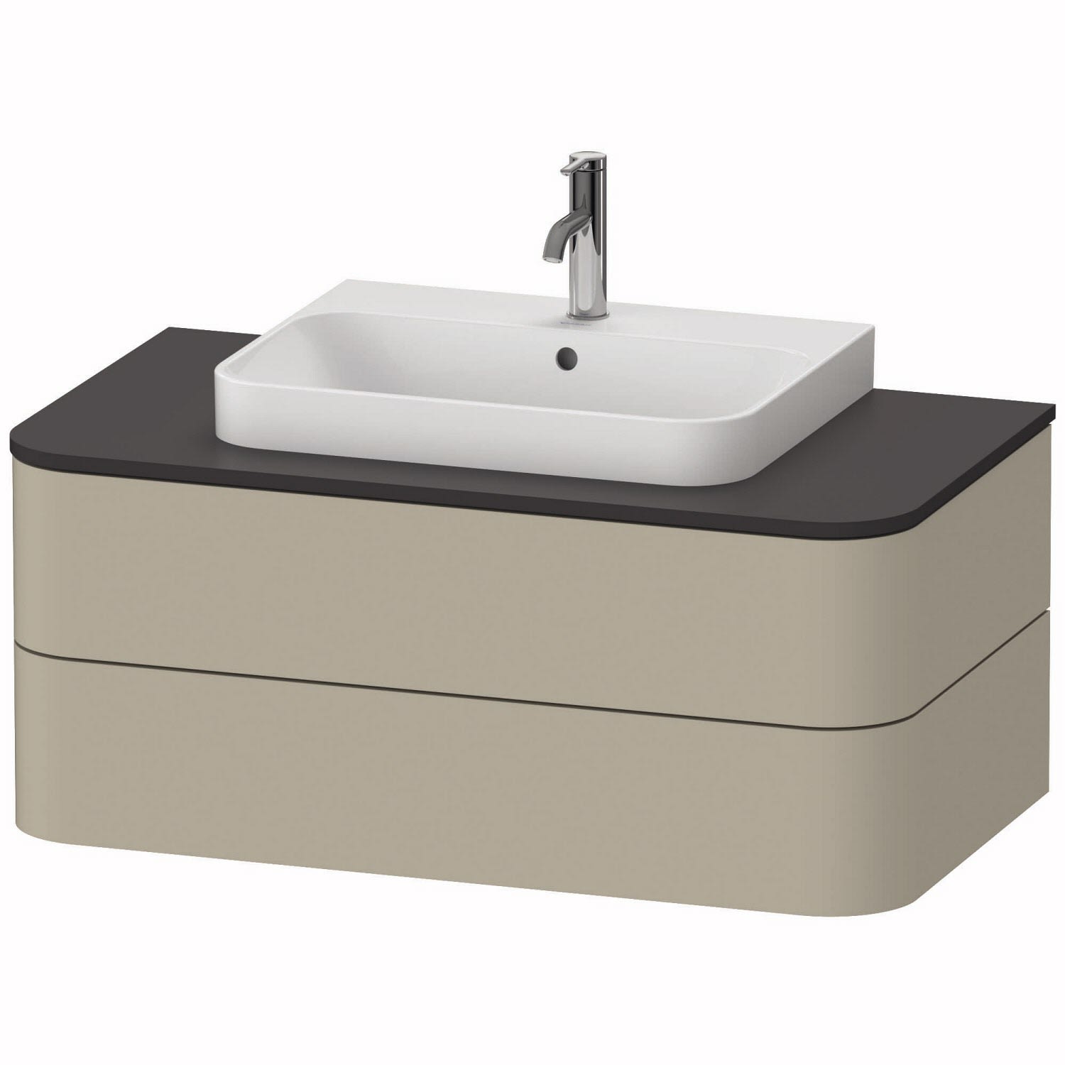 Modern und elegant präsentiert sich der wandhängende Konsolenwaschtischunterbau aus der Happy D.2 Plus Serie by sieger design. Zwei großzügige grifflose Vollauszüge mit hoher Tragfähigkeit Das unverwechselbare Design des Möbels mit seinen fein abgerundeten Ecken wird in den dazu passenden Aufsatzbecken konsequent weitergeführt. Sowohl für den Korpus wie auch für die dazu passende Konsolenplatte stehen zahlreiche Oberflächen- und Farbgestaltungen zur Auswahl – von unifarben bis raffiniert zweifarbig. Optional kann werkseitig ein cleveres Einrichtungssystem aus Massivholz sowie eine integrierte Innenbeleuchtung verbaut werden.