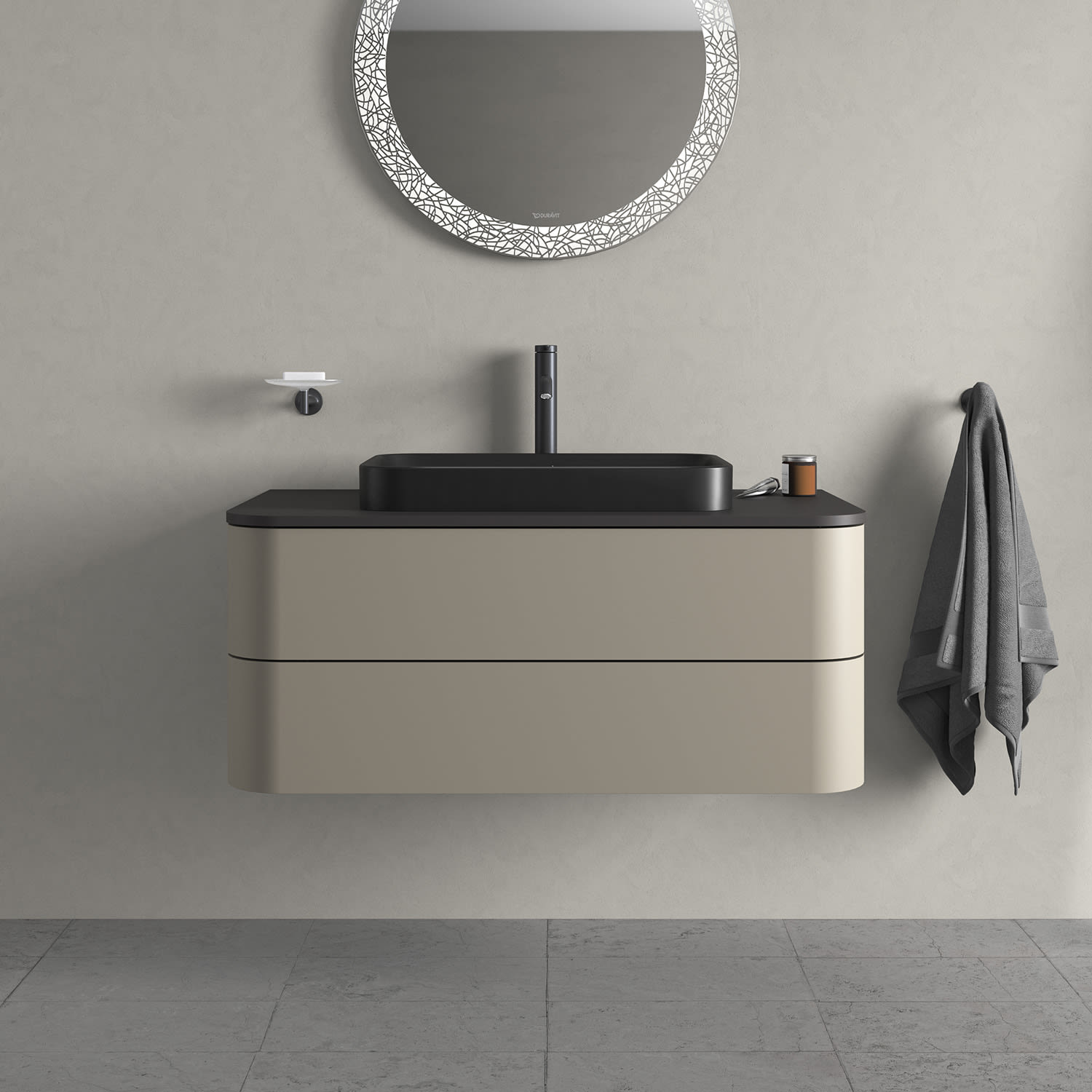 Modern und elegant präsentiert sich der wandhängende Konsolenwaschtischunterbau aus der Happy D.2 Plus Serie by sieger design. Zwei großzügige grifflose Vollauszüge mit hoher Tragfähigkeit Das unverwechselbare Design des Möbels mit seinen fein abgerundeten Ecken wird in den dazu passenden Aufsatzbecken konsequent weitergeführt. Sowohl für den Korpus wie auch für die dazu passende Konsolenplatte stehen zahlreiche Oberflächen- und Farbgestaltungen zur Auswahl – von unifarben bis raffiniert zweifarbig. Optional kann werkseitig ein cleveres Einrichtungssystem aus Massivholz sowie eine integrierte Innenbeleuchtung verbaut werden.