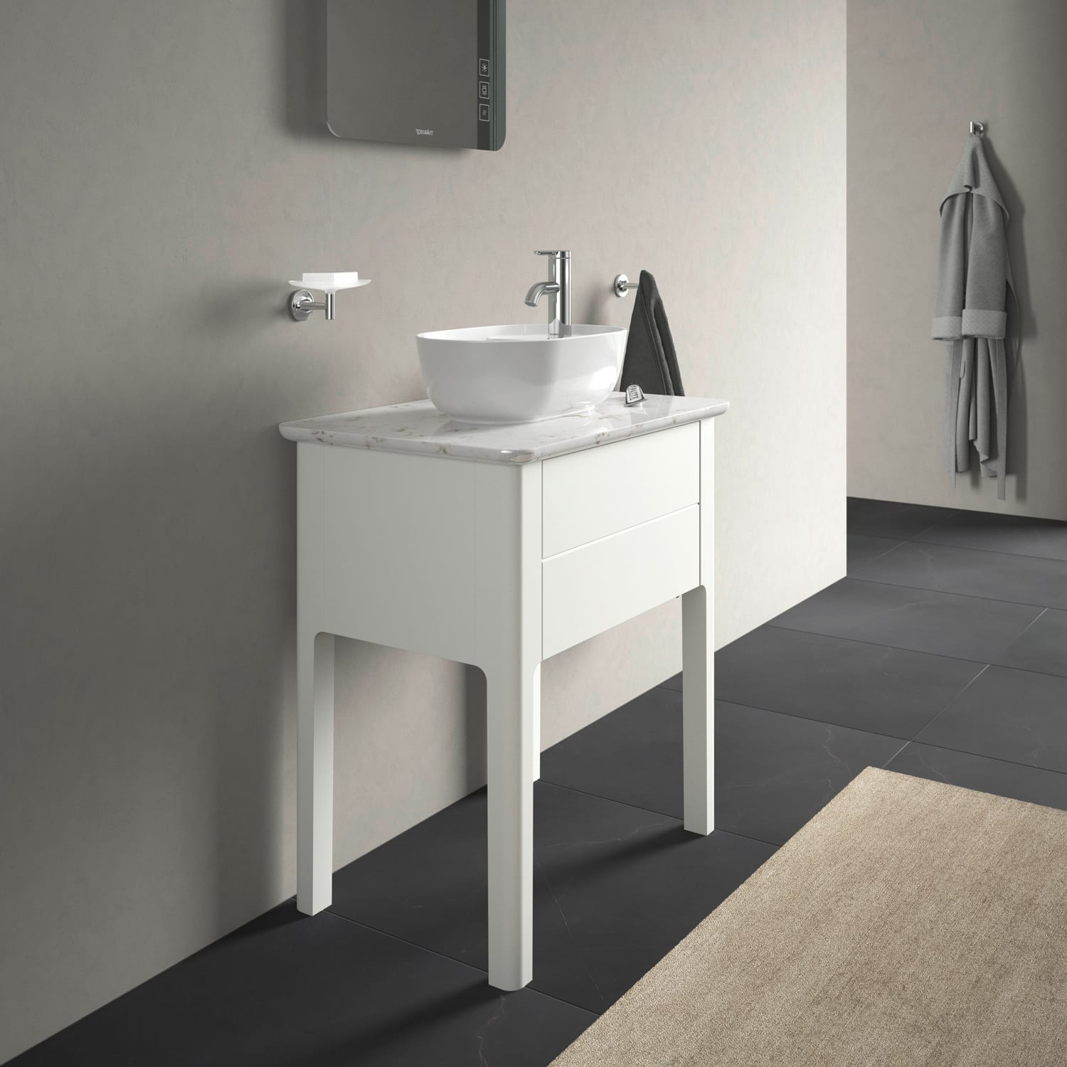 Dieser bodenstehende Duravit-Konsolenwaschtischunterbau stammt aus der puristischen Design-Reihe Luv der dänischen Designerin Cecilie Manz. Der Waschtischunterbau im Kommodenlook für einen Waschplatz verfügt über einen großzügigen Auszug, welcher ausreichend Platz für Handtücher und Pflegeprodukte bietet. Mit Tip-On-Technik lässt sich die Schublade mittels einfachem Fingerdruck öffnen. Dank Selbsteinzug mit Dämpfung schließt sie ebenso sanft und geräuschlos. Die Füße sind aus Massivholz gearbeitet und höhenverstellbar. Attraktive matte Lackoberflächen in unterschiedlichen Farbtönen, eine passende Konsolenplatte wahlweise aus Massivholz oder Quarzstein, sowie diverse dazu passende Aufsatzbecken bieten zahlreiche Möglichkeiten zur individuellen Waschplatzgestaltung. Zum Schutz vor Eindringen von Wasser und hoher Luftfeuchtigkeit gibt es keine offenen Kanten, der Unterbau ist also völlig nässeunempfindlich.