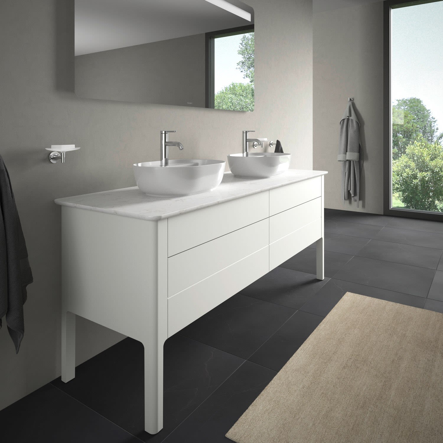 Dieser bodenstehende Duravit-Konsolenwaschtischunterbau stammt aus der puristischen Design-Reihe Luv der dänischen Designerin Cecilie Manz. Der Waschtischunterbau im Kommodenlook für zwei Aufsatzbecken verfügt über insgesamt vier großzügige Auszüge, in denen sich alle wichtigen Badutensilien bequem verstauen lassen. Durch die Tip-On-Technik lassen sich die Schubladen mittels einfachem Fingerdruck öffnen. Dank Selbsteinzug mit Dämpfung schließen sie ebenso sanft und geräuschlos. Die Füße sind aus Massivholz gearbeitet und höhenverstellbar. Attraktive matte Lackoberflächen in unterschiedlichen Farbtönen, eine passende Konsolenplatte wahlweise aus Massivholz oder Quarzstein, sowie diverse dazu passende Aufsatzbecken bieten zahlreiche Möglichkeiten zur individuellen Waschplatzgestaltung. Zum Schutz vor Eindringen von Wasser und hoher Luftfeuchtigkeit gibt es keine offenen Kanten, der Unterbau ist also völlig nässeunempfindlich.