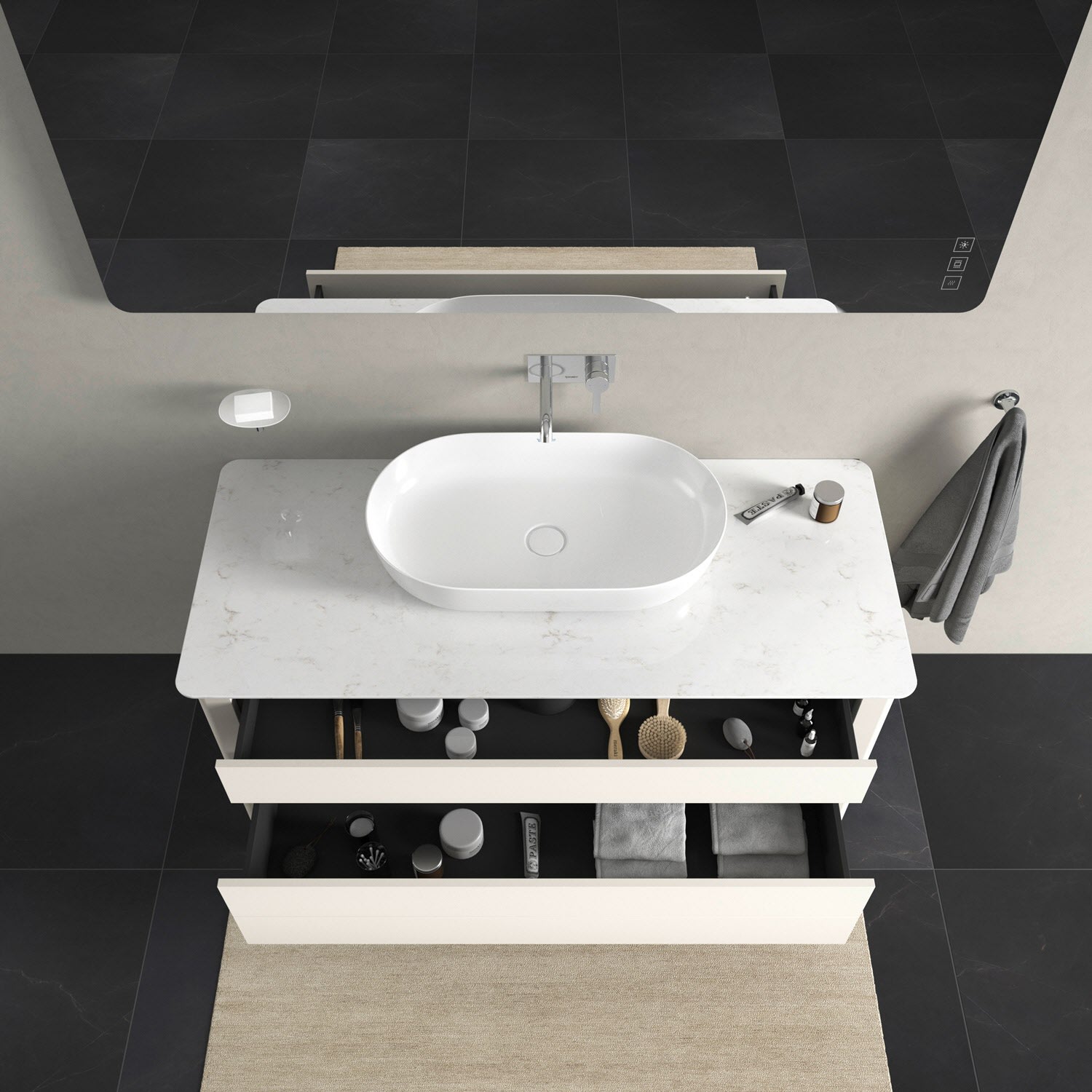 Dieser bodenstehende Duravit-Konsolenwaschtischunterbau stammt aus der puristischen Design-Reihe Luv der dänischen Designerin Cecilie Manz. Der Waschtischunterbau im Kommodenlook für einen Waschplatz verfügt über zwei großzügige Auszüge, welche ausreichend Platz für Handtücher und Pflegeprodukte bieten. Durch die Tip-On-Technik lassen sich die Schubladen mittels einfachem Fingerdruck öffnen. Dank Selbsteinzug mit Dämpfung schließen sie ebenso sanft und geräuschlos. Die Füße sind aus Massivholz gearbeitet und höhenverstellbar. Attraktive matte Lackoberflächen in unterschiedlichen Farbtönen, eine passende Konsolenplatte wahlweise aus Massivholz oder Quarzstein, sowie diverse dazu passende Aufsatzbecken bieten zahlreiche Möglichkeiten zur individuellen Waschplatzgestaltung. Zum Schutz vor Eindringen von Wasser und hoher Luftfeuchtigkeit gibt es keine offenen Kanten, der Unterbau ist also völlig nässeunempfindlich.