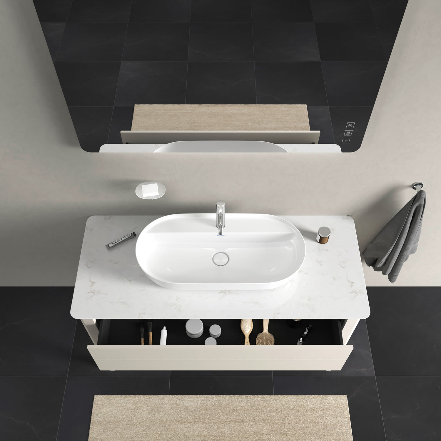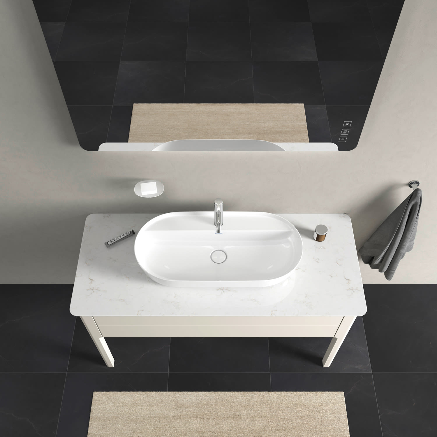 Dieser bodenstehende Duravit-Konsolenwaschtischunterbau stammt aus der puristischen Design-Reihe Luv der dänischen Designerin Cecilie Manz. Der Waschtischunterbau im Kommodenlook für einen Waschplatz verfügt über einen großzügigen Auszug, welcher ausreichend Platz für Handtücher und Pflegeprodukte bietet. Mit Tip-On-Technik lässt sich die Schublade mittels einfachem Fingerdruck öffnen. Dank Selbsteinzug mit Dämpfung schließt sie ebenso sanft und geräuschlos. Die Füße sind aus Massivholz gearbeitet und höhenverstellbar. Attraktive matte Lackoberflächen in unterschiedlichen Farbtönen, eine passende Konsolenplatte wahlweise aus Massivholz oder Quarzstein, sowie diverse dazu passende Aufsatzbecken bieten zahlreiche Möglichkeiten zur individuellen Waschplatzgestaltung. Zum Schutz vor Eindringen von Wasser und hoher Luftfeuchtigkeit gibt es keine offenen Kanten, der Unterbau ist also völlig nässeunempfindlich.