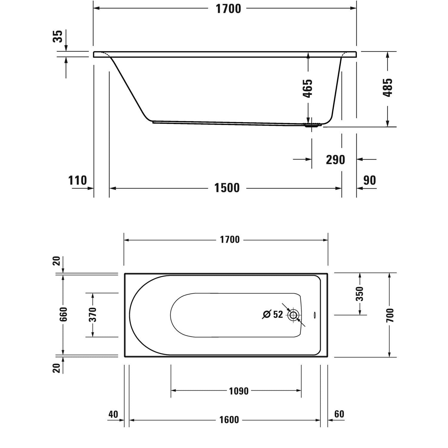 Duravit D-Neo Rechteck-Badewanne 170 x 70 cm, Einbauversion