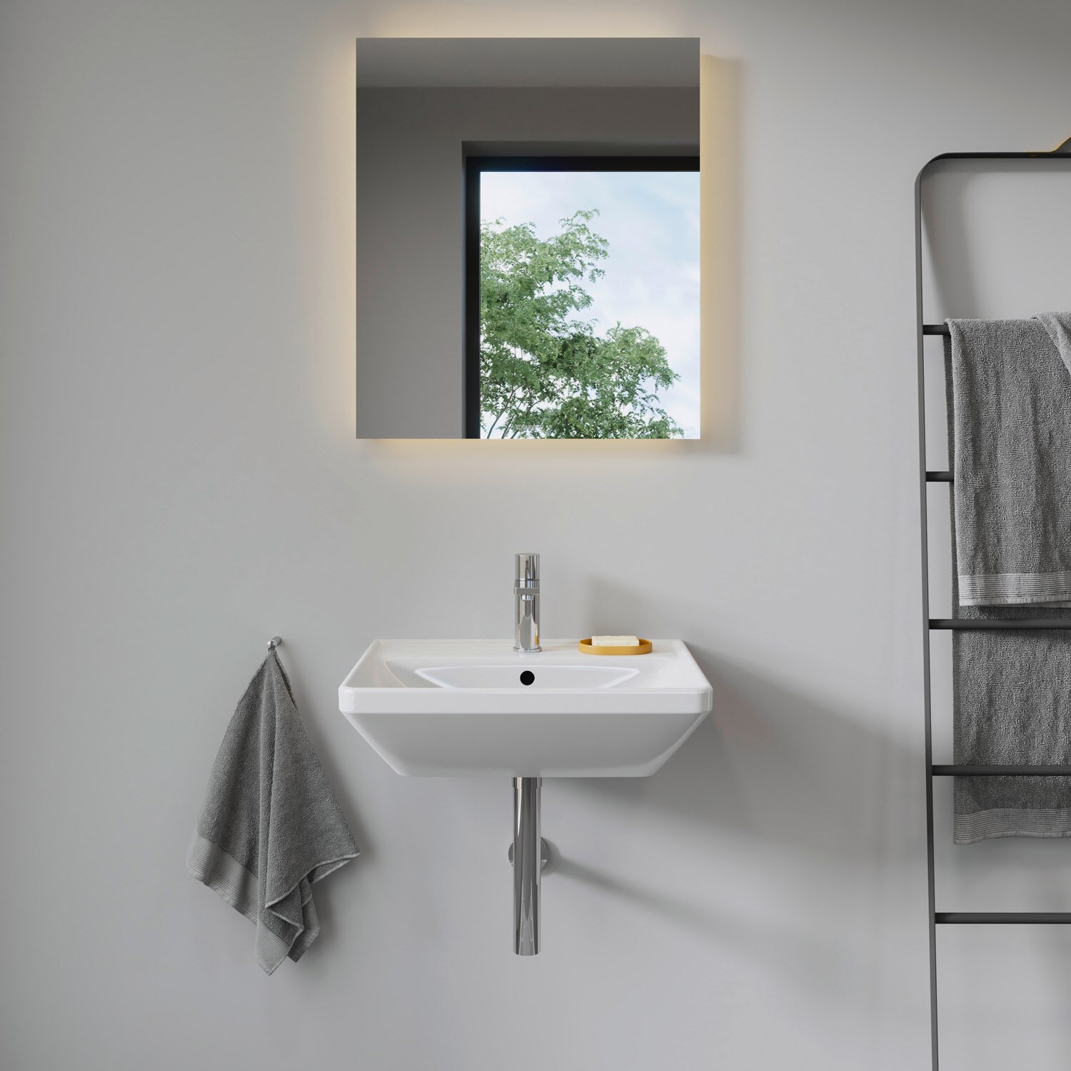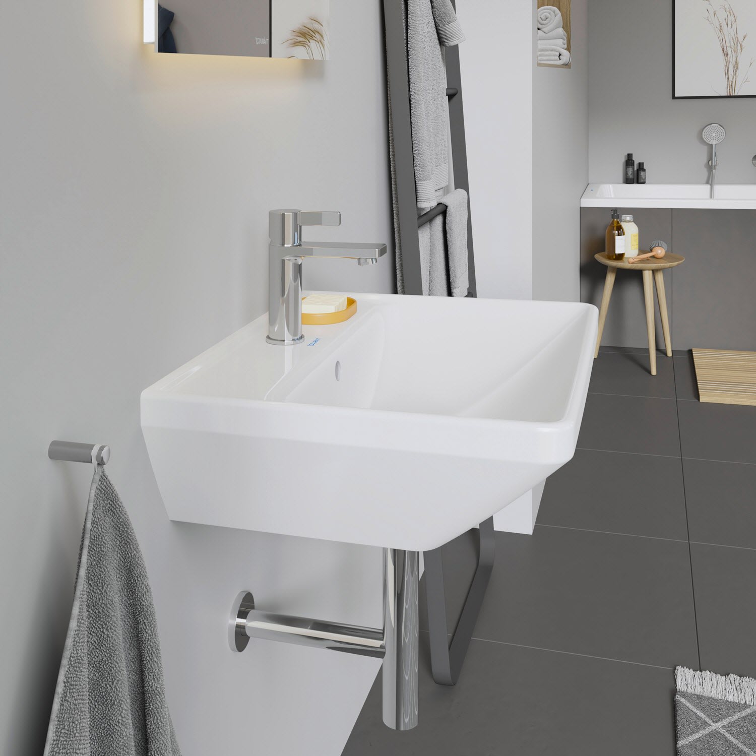 Stilvolles Design in bewährter Qualität bringt der Duravit D-Neo Waschtisch by Bertrand Lejoly in Ihr Bad! Das geradlinig-geometrisch gestaltete Waschbecken überzeugt mit seinem prägnanten, umlaufenden Rand und der präzisen Aufkantung, die effizient vor Überspritzen schützt. Seine klare, elegante Form mit kreisrundem Überlauf wird durch die großzügige Hahnlochbank gelungen betont. Hier findet sich ausreichend Platz für eine passende Duravit Waschtischarmatur, beispielsweise aus derselben Designserie, und eine nützliche Abstellfläche für wichtige Badutensilien. Die hochwertige, langlebige Sanitärkeramik zeichnet sich durch ihre kratzresistente und reinigungsfreundliche Oberfläche aus und ist optional mit der wasserabweisenden WonderGliss Keramikbeschichtung erhältlich, für eine besonders leichte Reinigung. Dank der ästhetischen und hygienischen Rundum-Glasierung eignet sich der puristische Waschtisch perfekt zur wandhängenden Einzelmontage. Als passendes Zubehör steht ein eleganter Design-Siphon zur Verfügung.