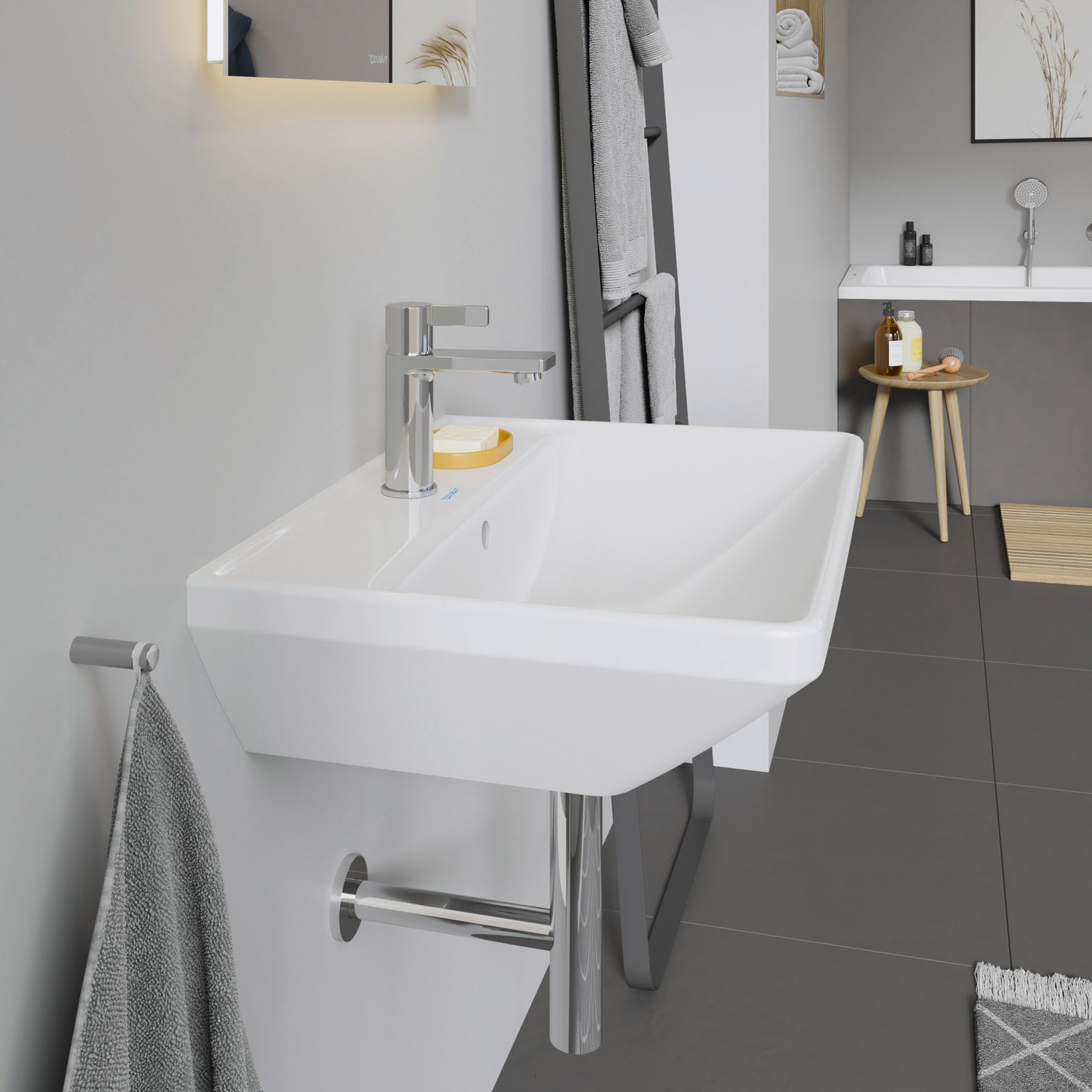 Stilvolles Design in bewährter Qualität bringt der Duravit D-Neo Waschtisch by Bertrand Lejoly in Ihr Bad! Das geradlinig-geometrisch gestaltete Waschbecken überzeugt mit seinem prägnanten, umlaufenden Rand und der präzisen Aufkantung, die effizient vor Überspritzen schützt. Seine klare, elegante Form mit kreisrundem Überlauf wird durch die großzügige Hahnlochbank gelungen betont. Hier findet sich ausreichend Platz für eine passende Duravit Waschtischarmatur, beispielsweise aus derselben Designserie, und eine nützliche Abstellfläche für wichtige Badutensilien. Die hochwertige, langlebige Sanitärkeramik zeichnet sich durch ihre kratzresistente und reinigungsfreundliche Oberfläche aus und ist optional mit der wasserabweisenden WonderGliss Keramikbeschichtung erhältlich, für eine besonders leichte Reinigung. Dank der ästhetischen und hygienischen Rundum-Glasierung eignet sich der puristische Waschtisch perfekt zur wandhängenden Einzelmontage. Als passendes Zubehör steht ein eleganter Design-Siphon zur Verfügung.