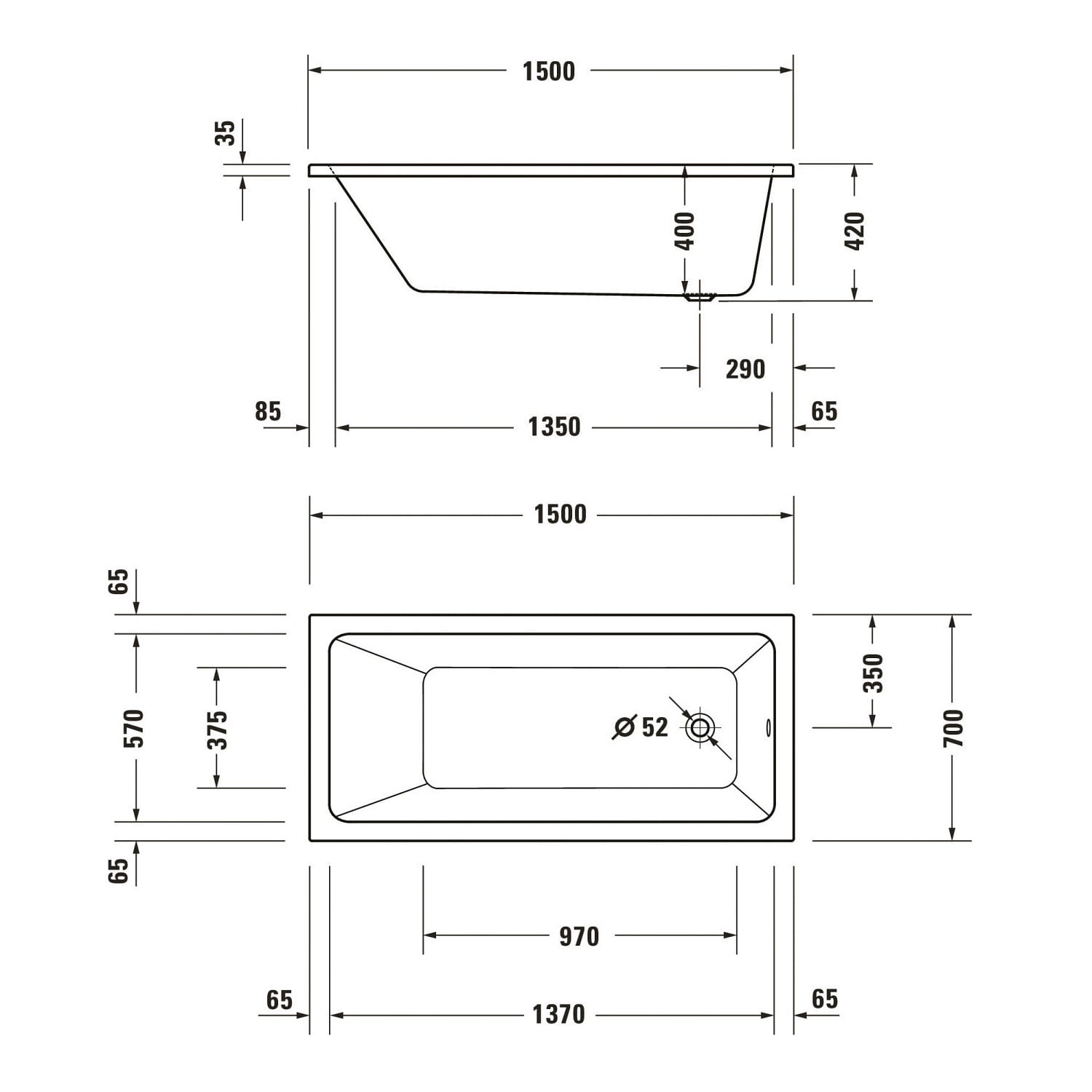 Duravit No. 1 Rechteck-Badewanne 150 x 70 cm mit 1 Rückenschräge