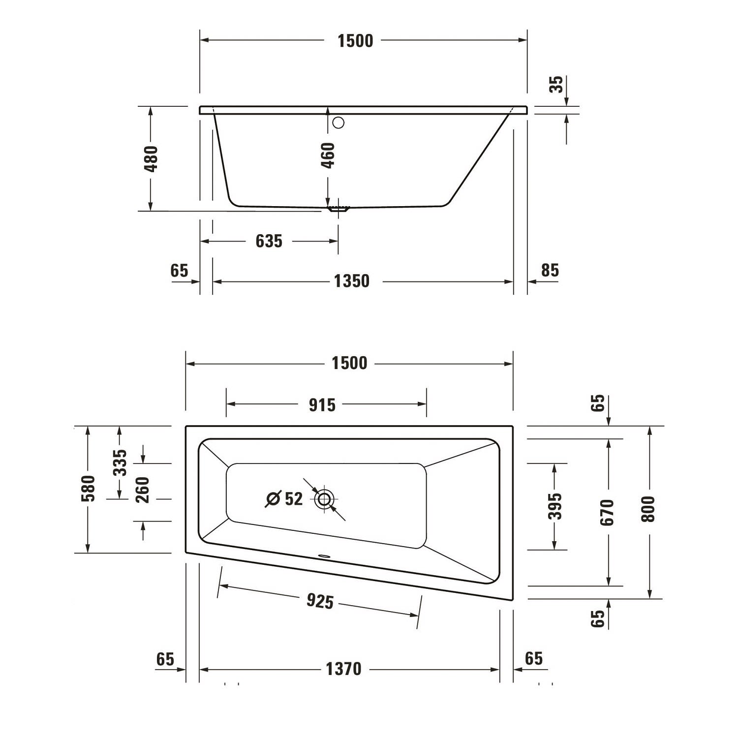 Duravit No. 1 Trapez-Whirlwanne Jet Project 150 x 80 cm mit 1 Rückenschräge rechts