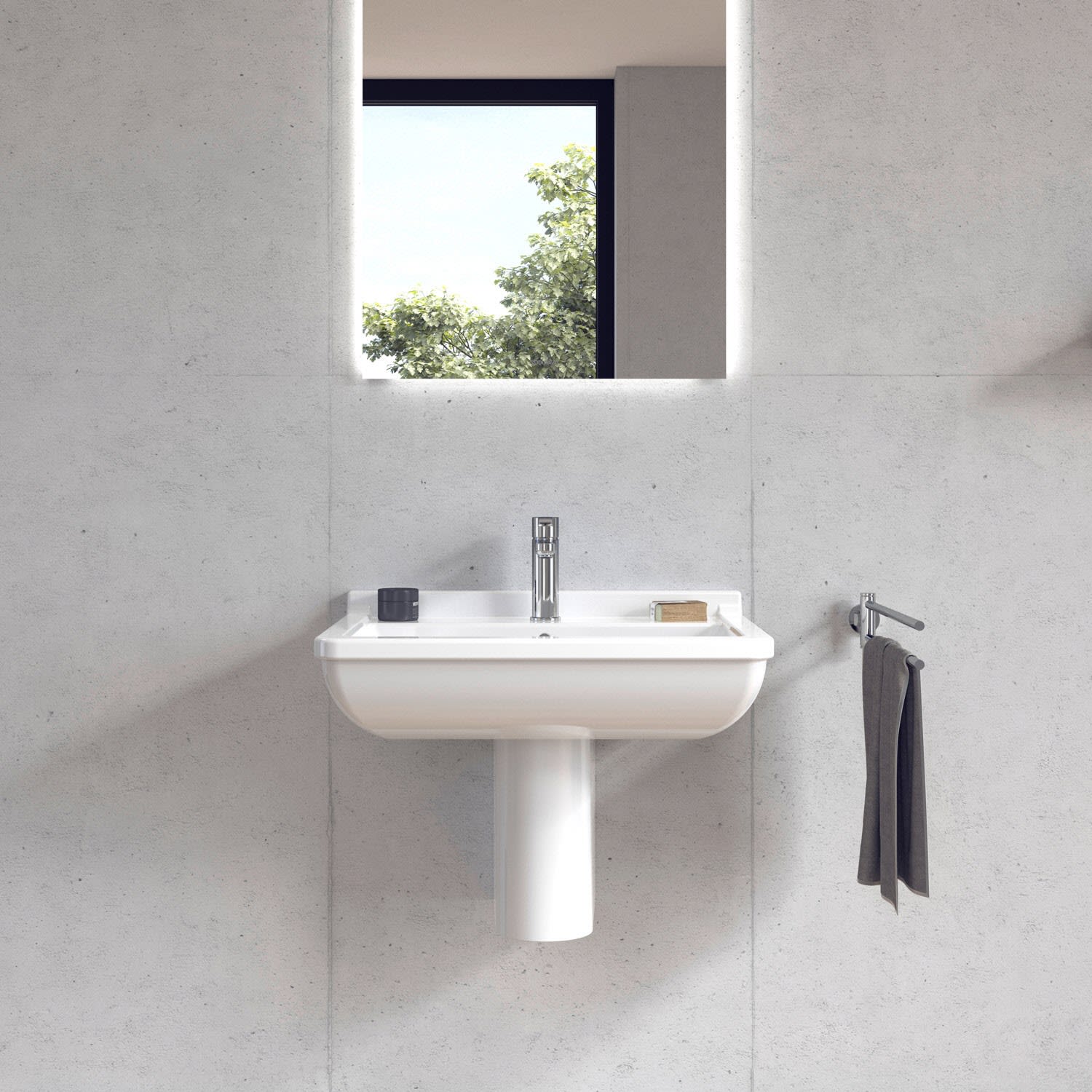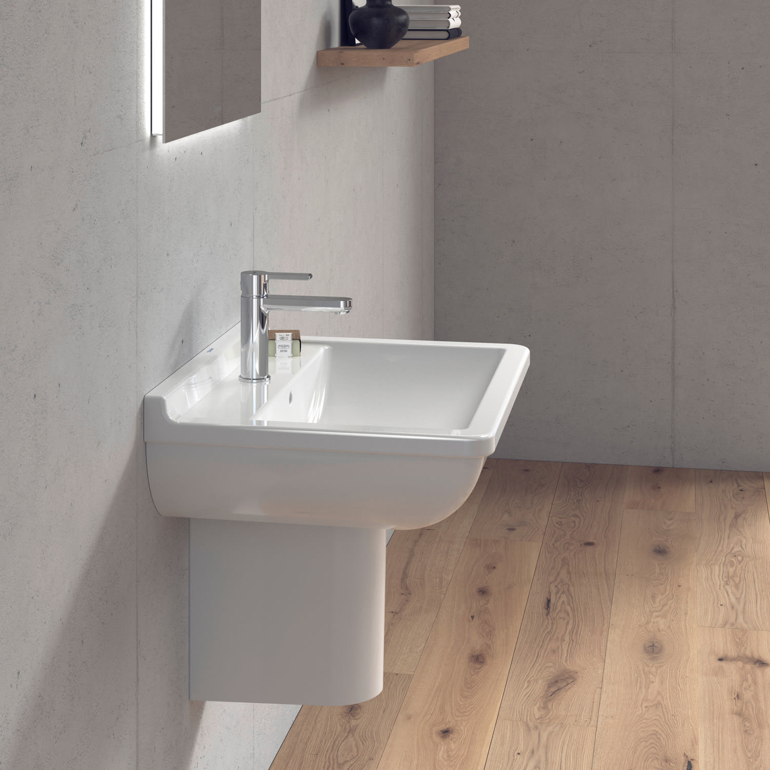 In klassischem Design und zeitloser Ästhetik präsentiert sich der wandhängende Duravit Starck 3 Waschtisch mit Überlauf von Star-Designer Philippe Starck. Die prägnante Linienführung des umlaufenden Randes greift tradierte Motive einer ebenso klaren wie eleganten Formensprache auf und überzeugt mit höchster Funktionalität: die unaufdringliche Aufkantung bildet einen effektiven Spritzschutz und rahmt die schlichte Hahnlochbank gelungen ein. Die hochwertige Sanitärkeramik des ikonischen Waschtischs kennzeichnet sich durch widerstandsfähige und kratzresistente Oberflächen und steht für maximale Hygiene. Der Waschtisch ist komplett von unten glasiert und eignet sich perfekt als wandhängender Solitär. Als elegante Verkleidung des Siphons kann sowohl eine passende Halb- wie auch eine Standsäule bestellt werden.