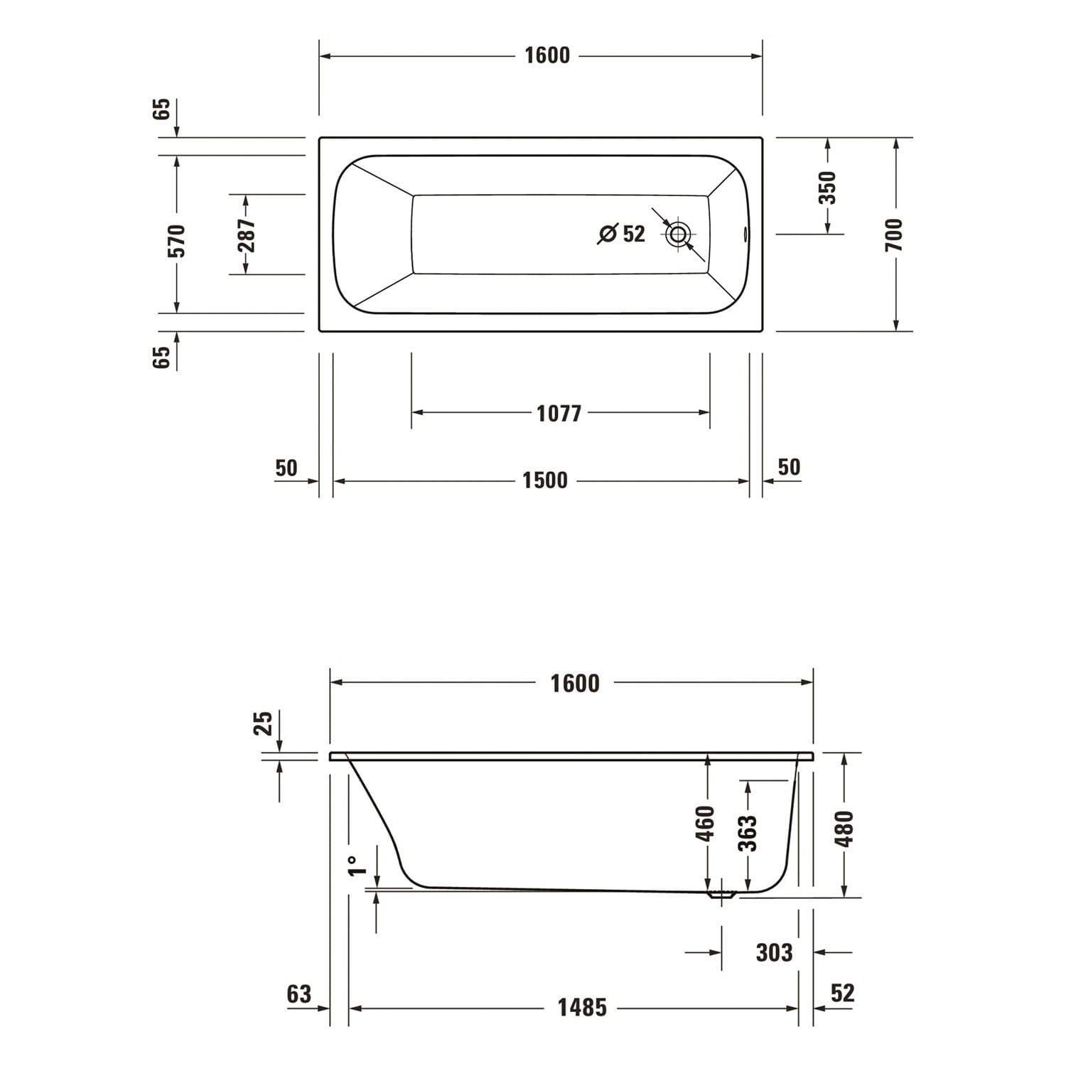 - Ablaufposition am Fußende mit Ø 5,2 cm