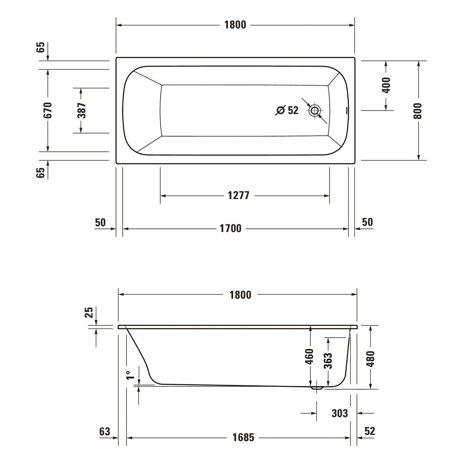 - Ablaufposition am Fußende mit Ø 5,2 cm