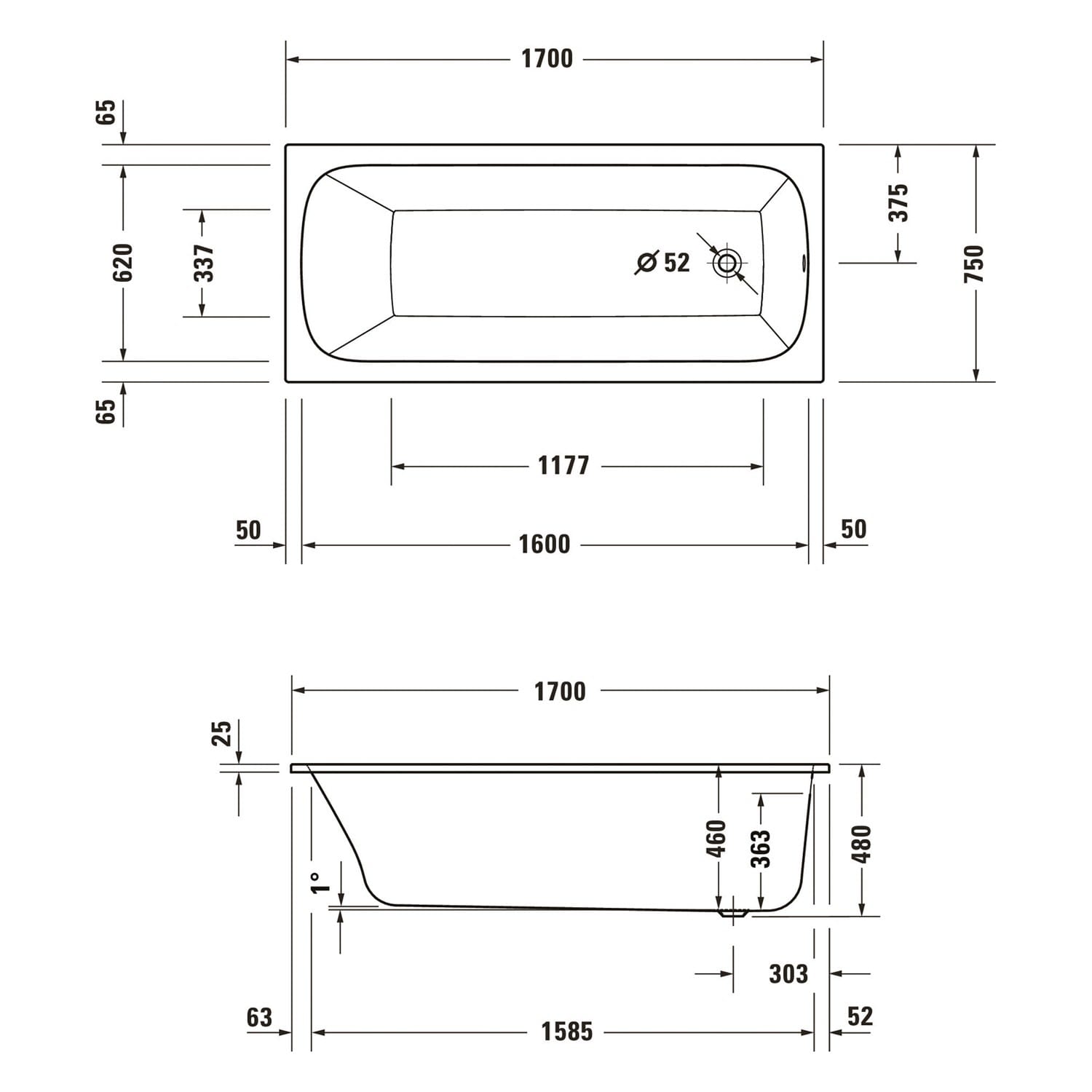 - Ablaufposition am Fußende mit Ø 5,2 cm