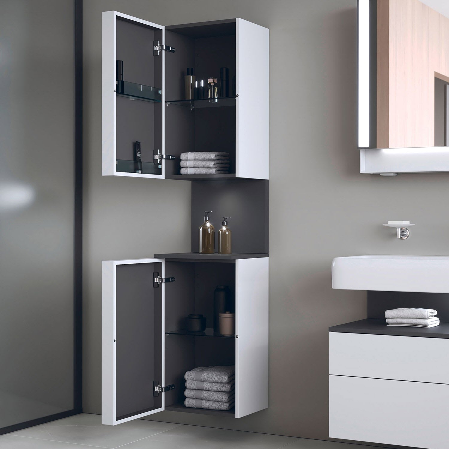 - Antifingerprint-Beschichtung verhindert das Zurückbleiben lästiger Fingerabdrücke auf den Badezimmermöbeln (nur bei "supermatt" Dekoren zutreffend)