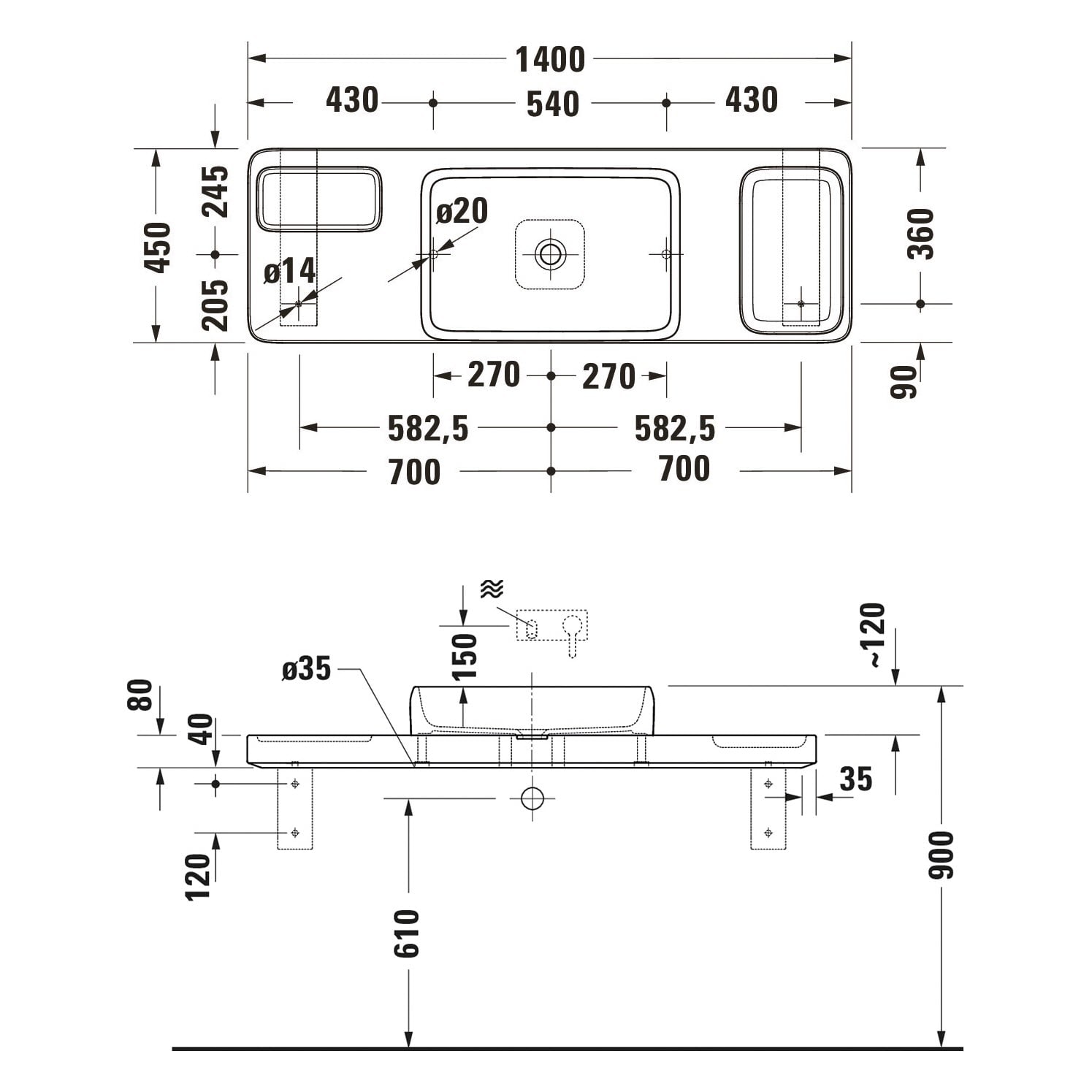 B: 140 T: 45 H: 20 cm