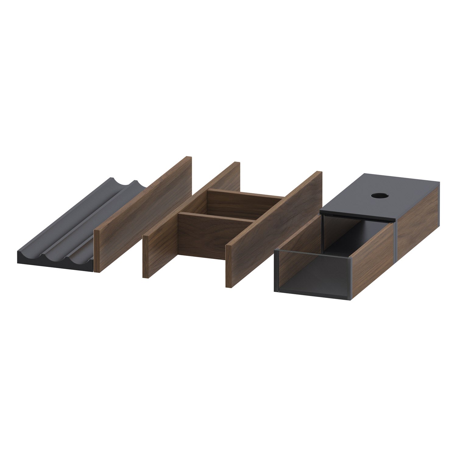 In Abhängigkeit der Schubkasten- oder Auszugsbreite beinhalten die Einrichtungssysteme verschiedene Elemente wie Aufbewahrungsboxen inkl. Deckel, Ablagewellen in klein für Kosmetikartikel oder groß für runde, liegende Behälter sowie Holzgitter mit verschiedenen Aufteilungen um bspw. Lotionen fixieren zu können.