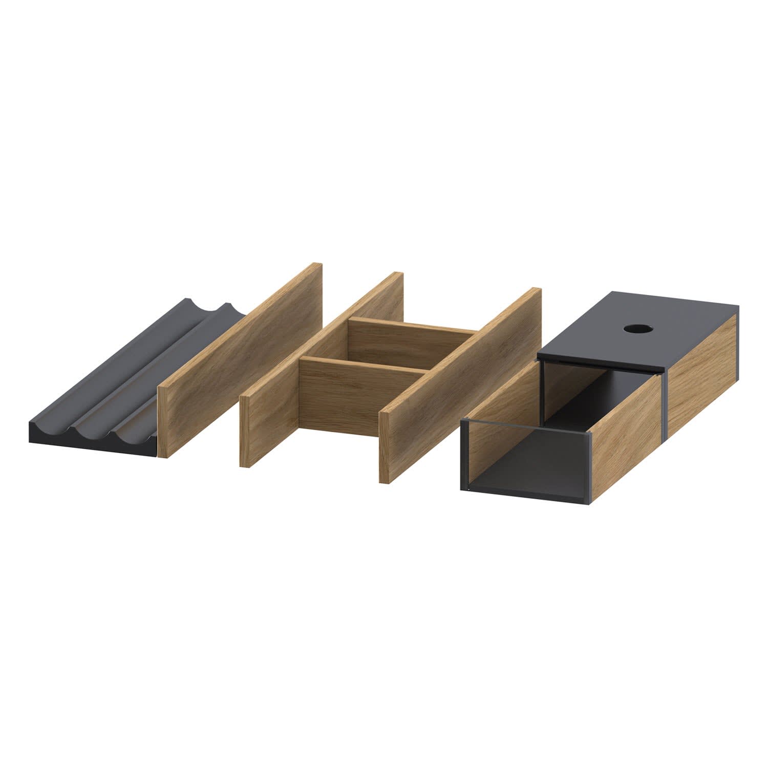 In Abhängigkeit der Schubkasten- oder Auszugsbreite beinhalten die Einrichtungssysteme verschiedene Elemente wie Aufbewahrungsboxen inkl. Deckel, Ablagewellen in klein für Kosmetikartikel oder groß für runde, liegende Behälter sowie Holzgitter mit verschiedenen Aufteilungen um bspw. Lotionen fixieren zu können.