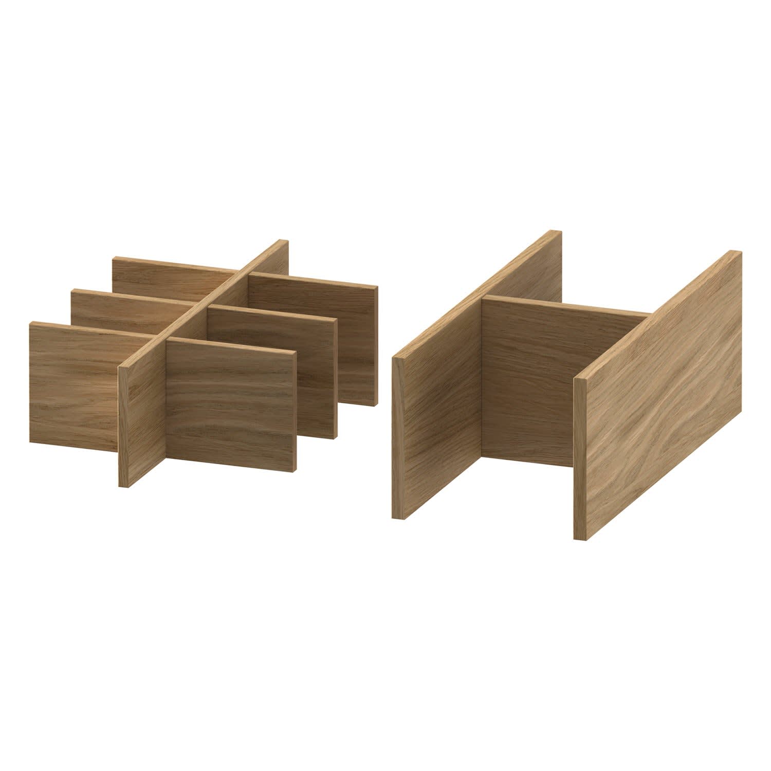 In Abhängigkeit der Schubkasten- oder Auszugsbreite beinhalten die Einrichtungssysteme verschiedene Elemente wie Aufbewahrungsboxen inkl. Deckel, Ablagewellen in klein für Kosmetikartikel oder groß für runde, liegende Behälter sowie Holzgitter mit verschiedenen Aufteilungen um bspw. Lotionen fixieren zu können.