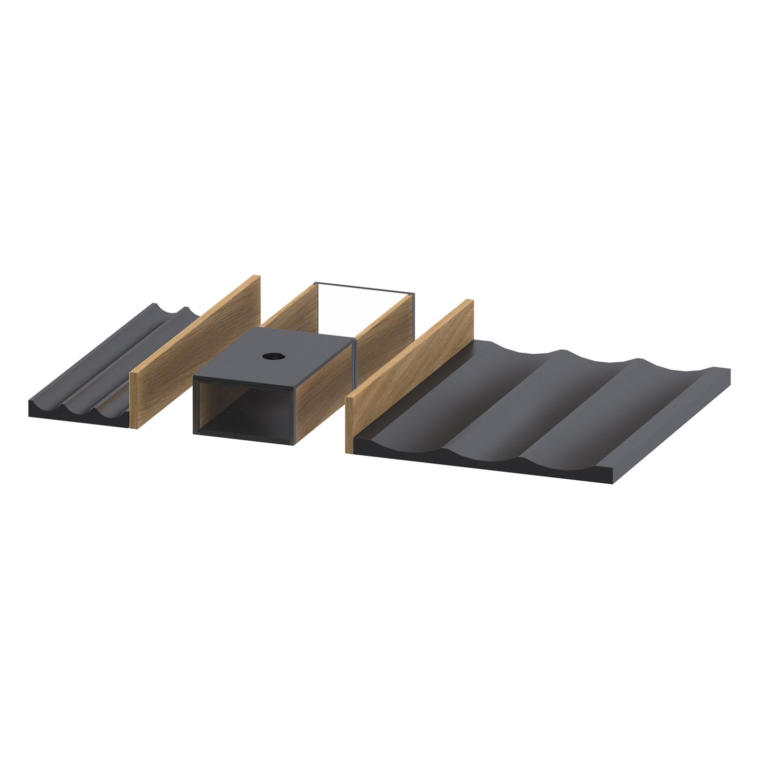 In Abhängigkeit der Schubkasten- oder Auszugsbreite beinhalten die Einrichtungssysteme verschiedene Elemente wie Aufbewahrungsboxen inkl. Deckel, Ablagewellen in klein für Kosmetikartikel oder groß für runde, liegende Behälter sowie Holzgitter mit verschiedenen Aufteilungen um bspw. Lotionen fixieren zu können.