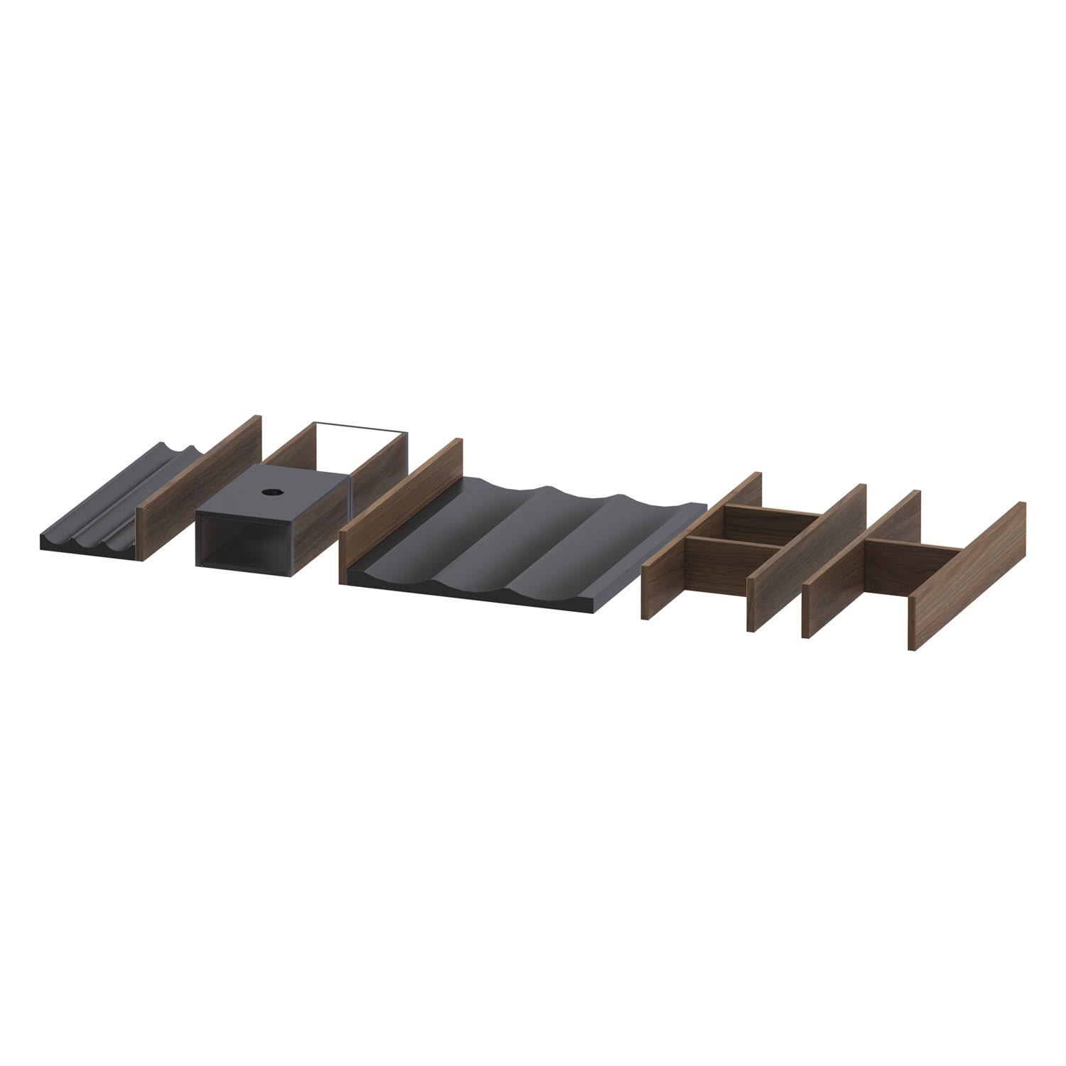 In Abhängigkeit der Schubkasten- oder Auszugsbreite beinhalten die Einrichtungssysteme verschiedene Elemente wie Aufbewahrungsboxen inkl. Deckel, Ablagewellen in klein für Kosmetikartikel oder groß für runde, liegende Behälter sowie Holzgitter mit verschiedenen Aufteilungen um bspw. Lotionen fixieren zu können.