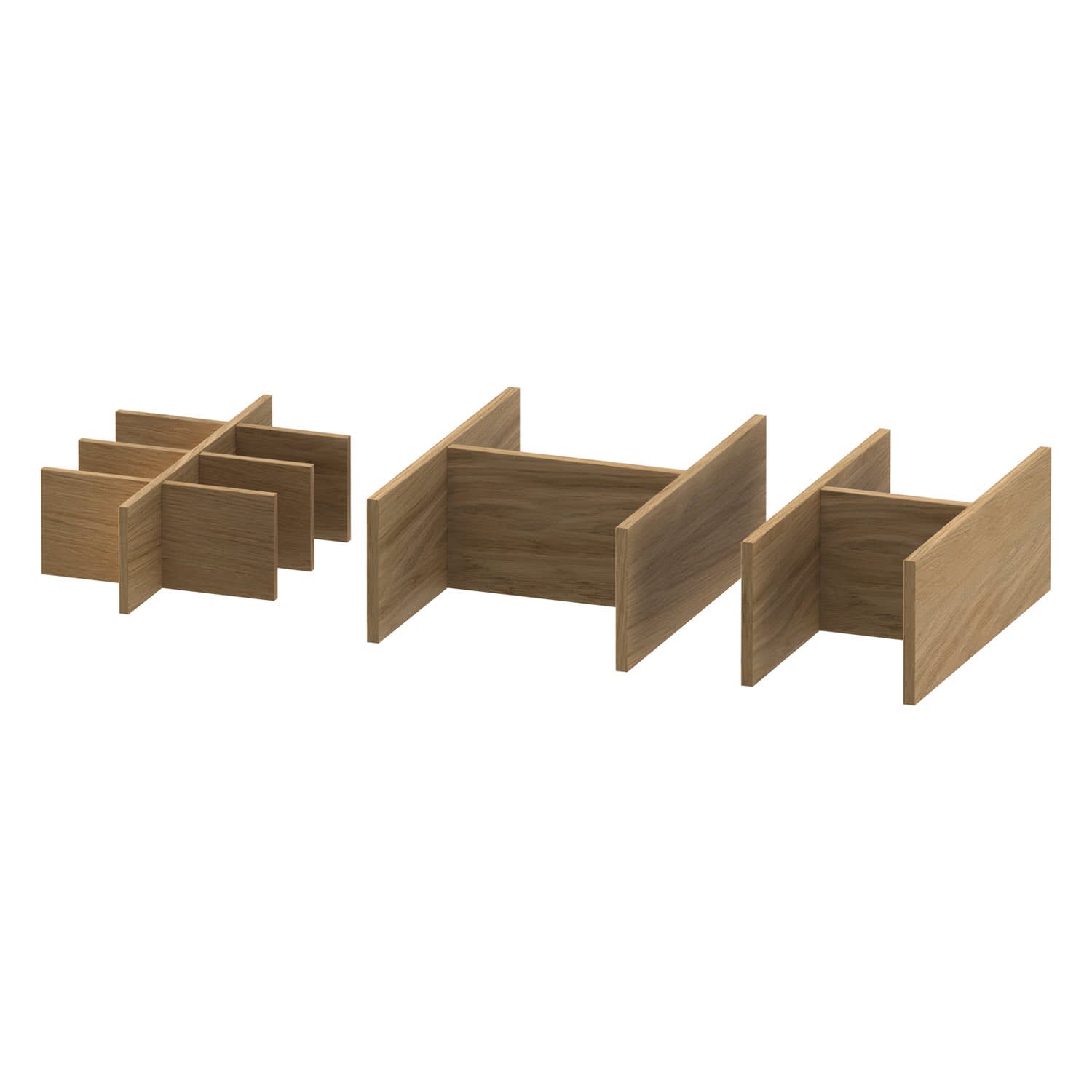In Abhängigkeit der Schubkasten- oder Auszugsbreite beinhalten die Einrichtungssysteme verschiedene Elemente wie Aufbewahrungsboxen inkl. Deckel, Ablagewellen in klein für Kosmetikartikel oder groß für runde, liegende Behälter sowie Holzgitter mit verschiedenen Aufteilungen um bspw. Lotionen fixieren zu können.
