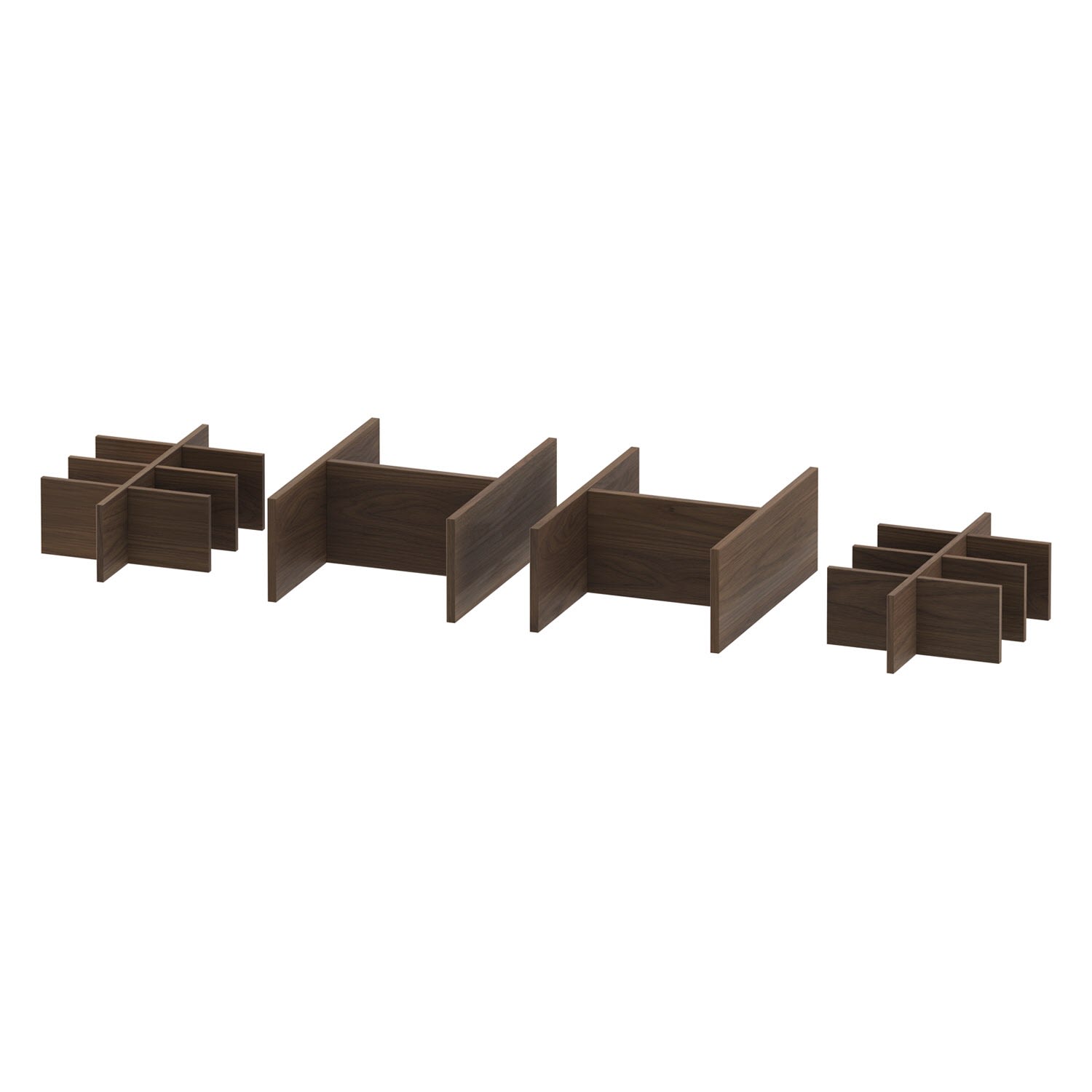 In Abhängigkeit der Schubkasten- oder Auszugsbreite beinhalten die Einrichtungssysteme verschiedene Elemente wie Aufbewahrungsboxen inkl. Deckel, Ablagewellen in klein für Kosmetikartikel oder groß für runde, liegende Behälter sowie Holzgitter mit verschiedenen Aufteilungen um bspw. Lotionen fixieren zu können.