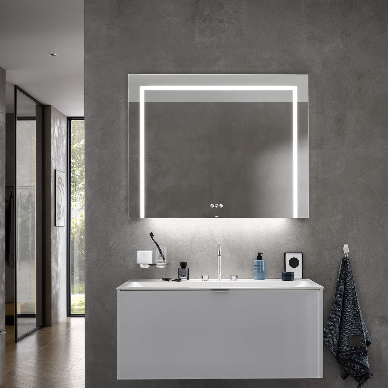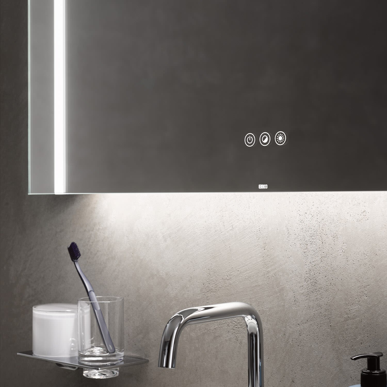 Emco MI 220+ LED-Badspiegel 70 cm mit drei Lichtausschnitten und Touch-Bedienfeld in Aluminium