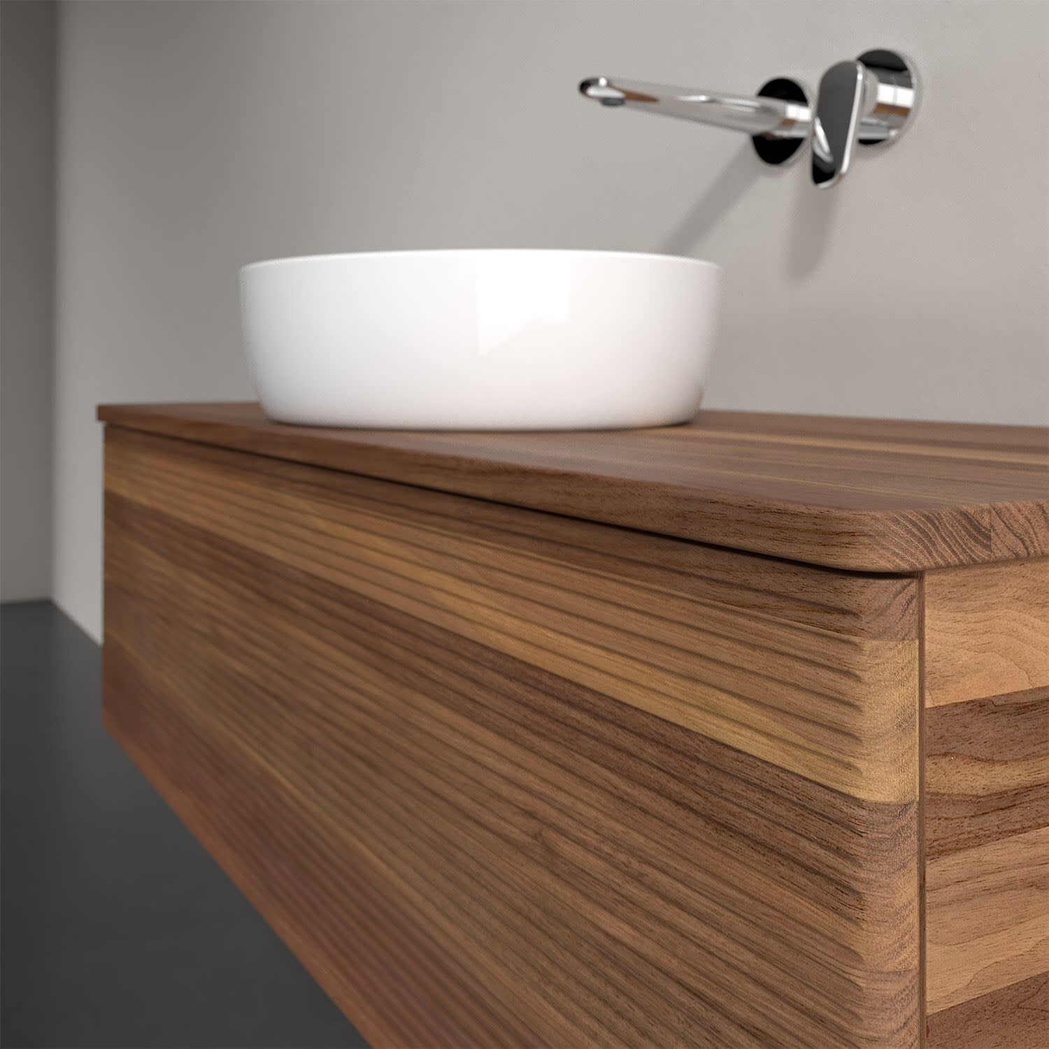 Countertop washbasins from various series are available for this vanity unit (see "Fitting list" under Downloads). You will find a selected example in the accessories. Please order the washbasin separately.