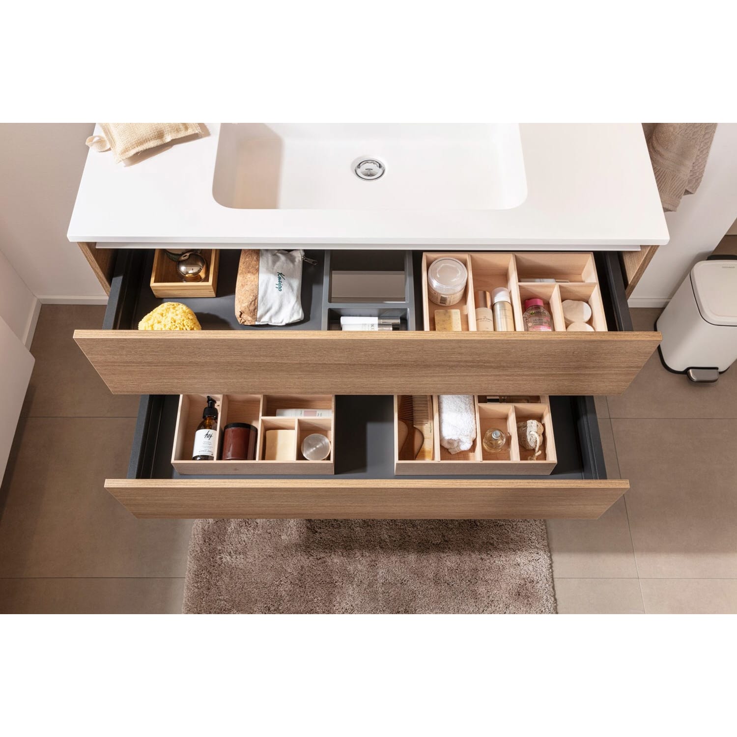 Der Fackelmann Waschtischunterschrank aus der Serie VITA kombiniert Funktionalität mit elegantem Design und ist eine ideale Ergänzung für jedes moderne Badezimmer. Die harmonische Farbkombination aus Summer Oak und weißen Griffleisten verleiht Ihrem Bad eine warme, einladende Atmosphäre.