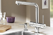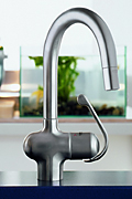 Für jede Arbeitsweise mit Wasser im Spülbecken oder am Spültisch bietet GROHE eine passende Küchenarmatur; das Design befriedigt daneben ästhetsche Empfindungen und Paradigmen. Viele Hebelpositionen und Auslaufformen nehmen Ihre (geheimen) Wünsche und Nöte vorweg. Weiterhin gibt es verschiedene Spülbrausen - K7 mit großen Pendelbrausen, Auszugsbrausen sind in praktisch jeden Auslauf einpassbar und eine Option im Sortiment. Schließlich bietet GROHE als Sperrspitze der Produktevolution noch "Blue" und "Red". Vergessen wir auch nicht die Küchenspülen ...