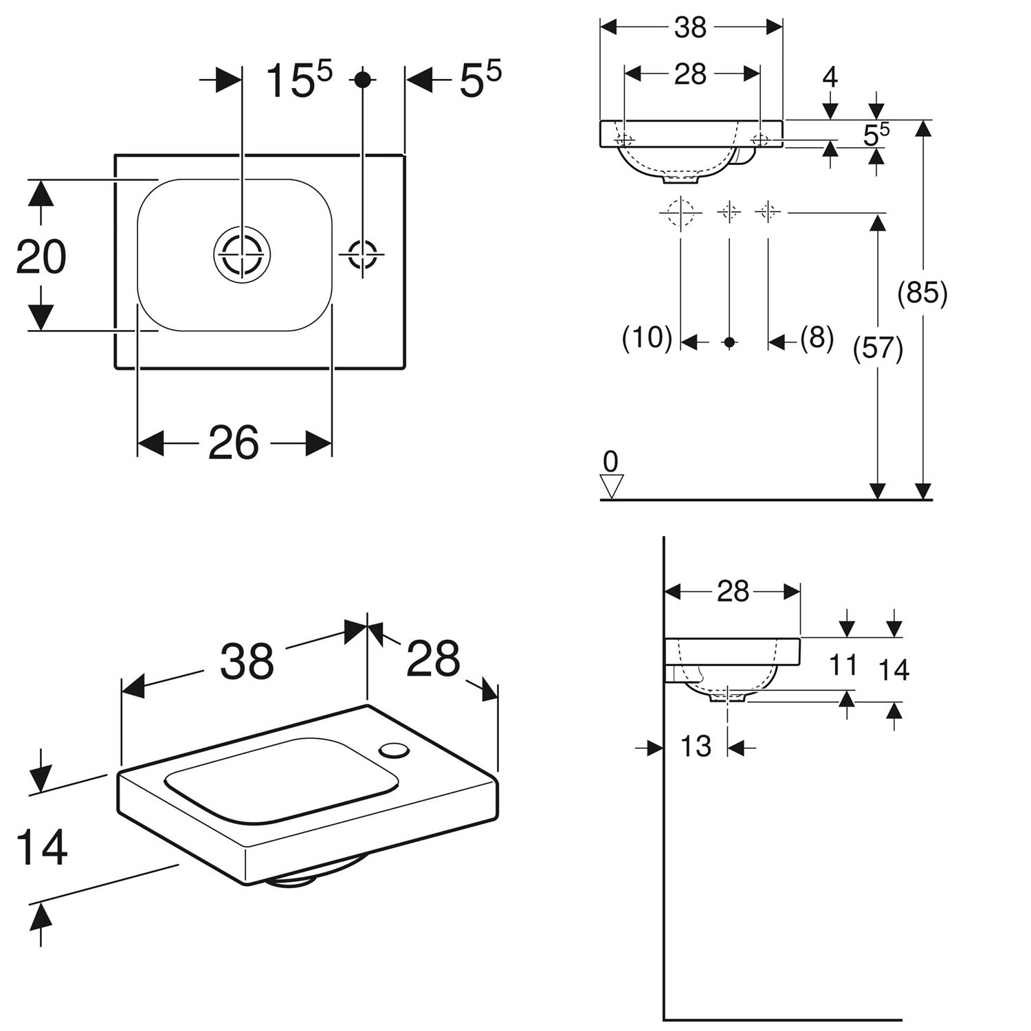 Geberit iCon Light Handwaschbecken 38 cm, mit 1 Hahnloch rechts, ohne Überlauf
