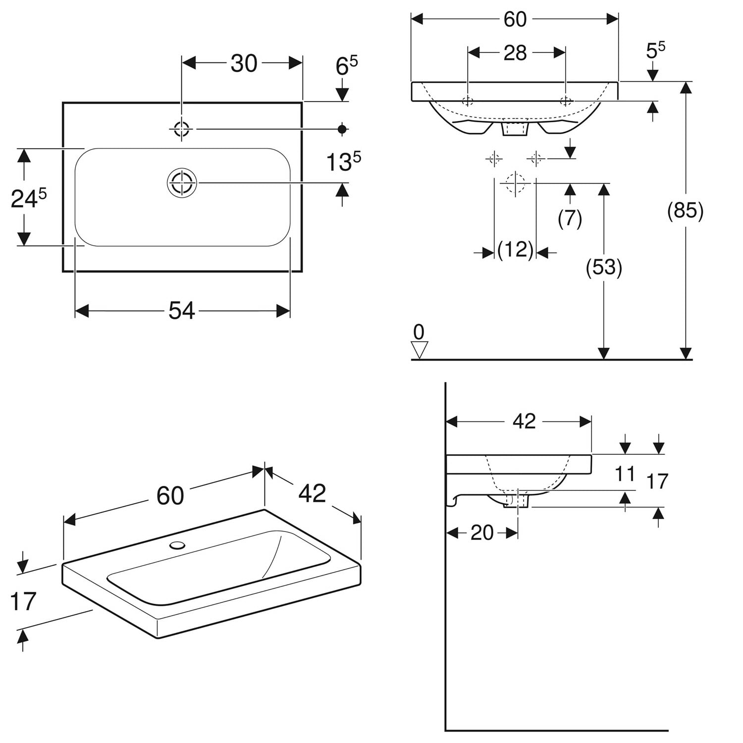 Geberit iCon Light Waschtisch 60 cm verkürzte Ausladung, mit 1 Hahnloch, ohne Überlauf