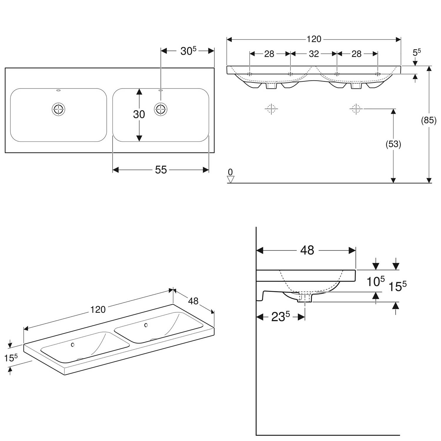 Geberit iCon Light Doppelwaschtisch 120 cm, ohne Hahnloch, mit 2 Überläufen