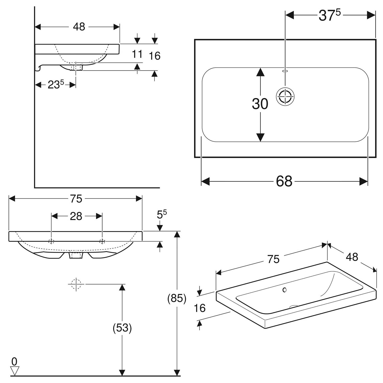 Geberit iCon Aufsatzwaschtisch 75 cm ohne Hahnloch, mit Überlauf