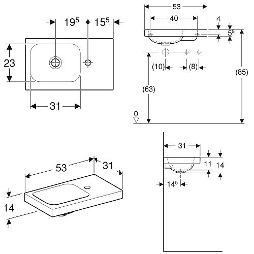 Geberit iCon Light Handwaschbecken 53 cm mit Ablagefläche, mit 1 Hahnloch rechts, ohne Überlauf