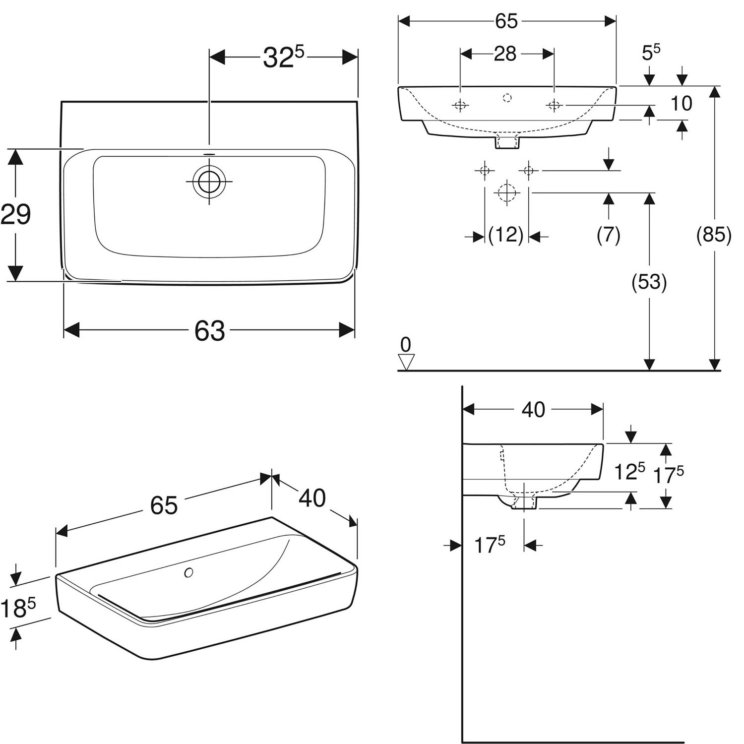 Geberit Renova Compact Waschtisch 65 cm ohne Hahnloch, mit Überlauf