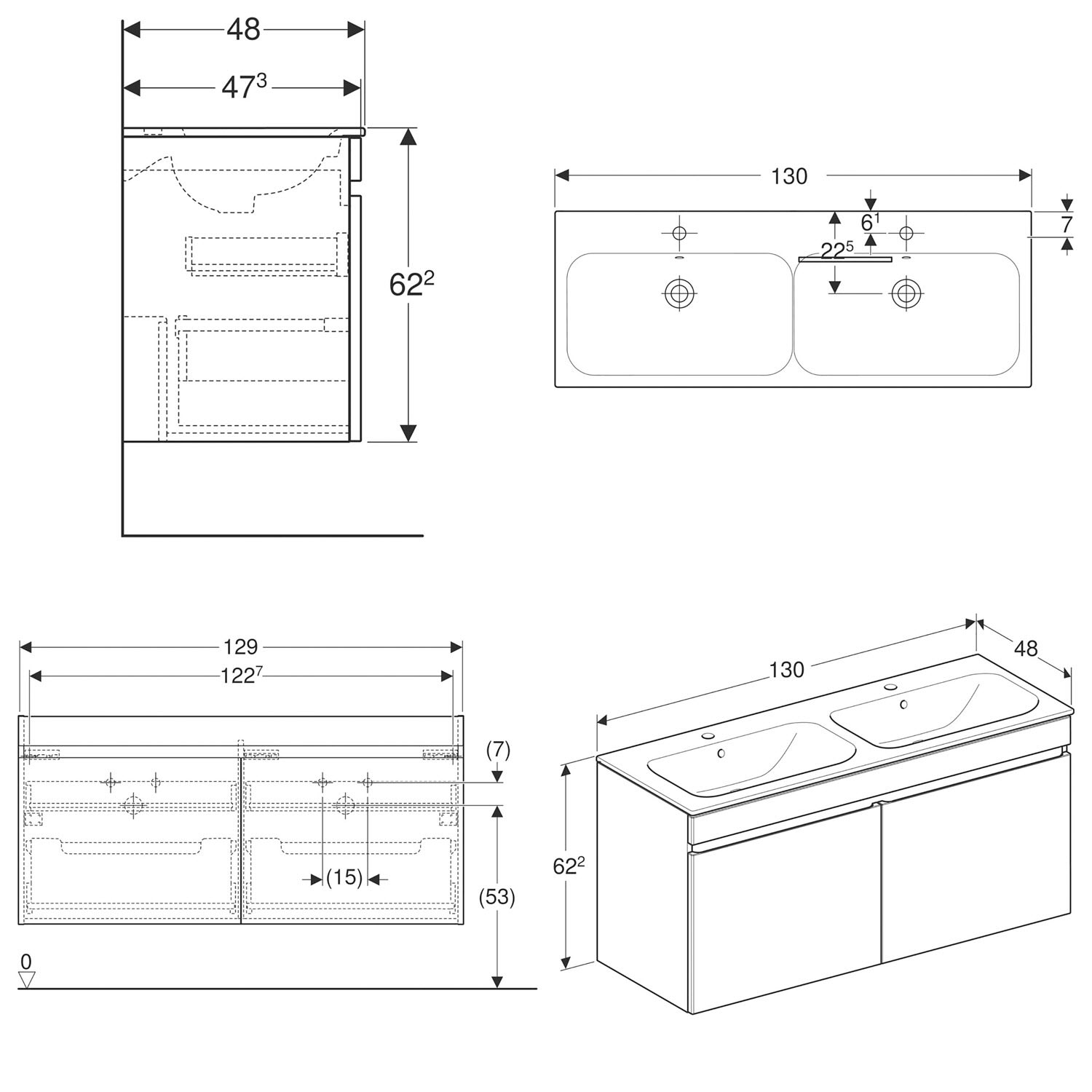 Geberit Renova Plan Set Doppelmöbelwaschtisch schmaler Rand mit 2 Schubladen und 2 Innenschubladen 130 cm
