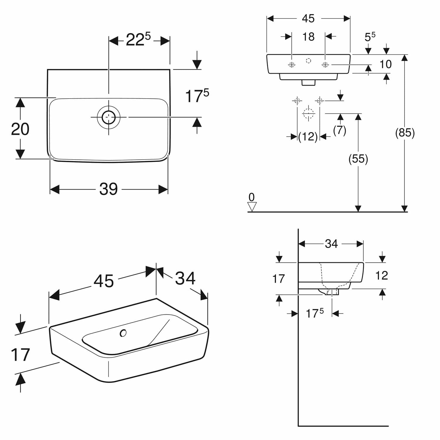 Geberit Renova Plan Handwaschbecken 45 cm, ohne Hahnloch, mit Überlauf