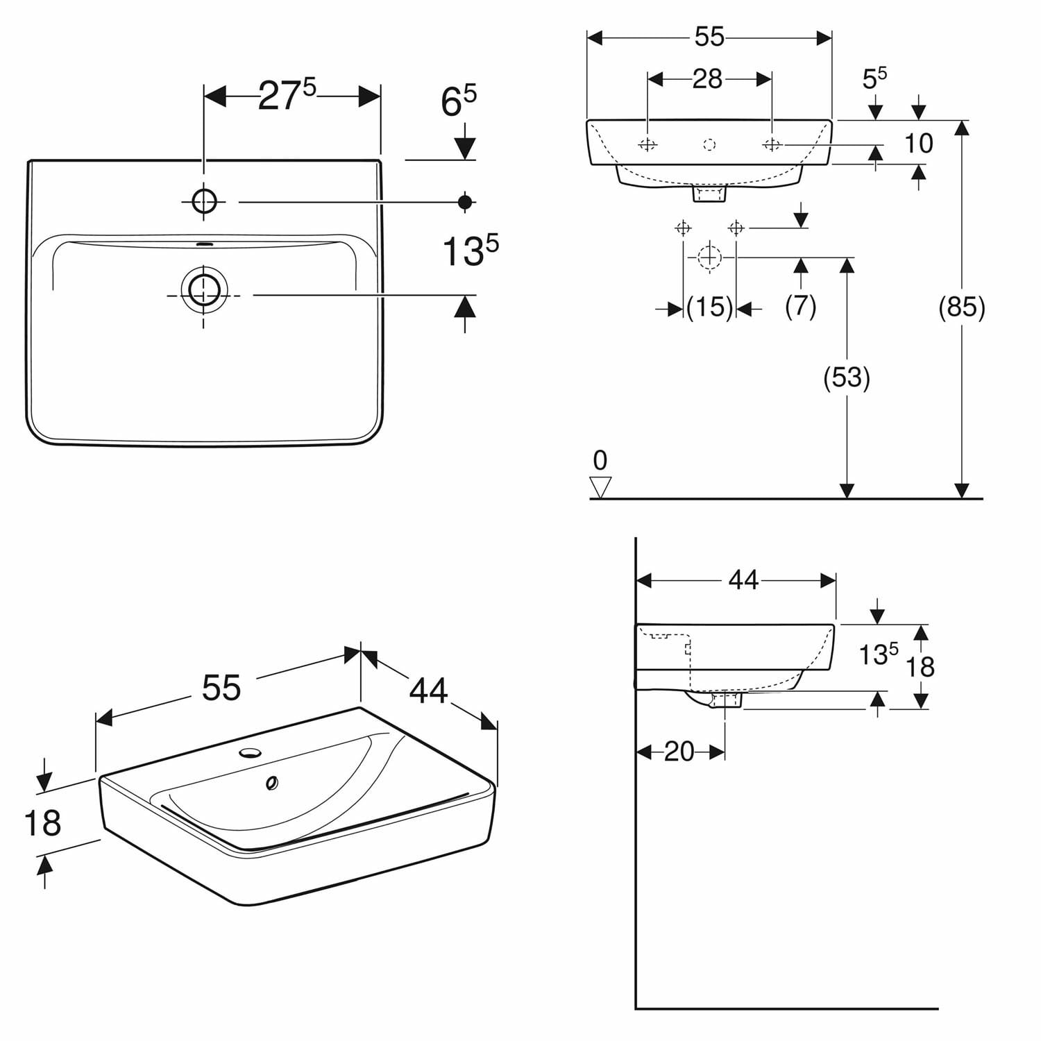 Geberit Renova Plan Waschtisch 55 cm, mit 1 Hahnloch, mit Überlauf