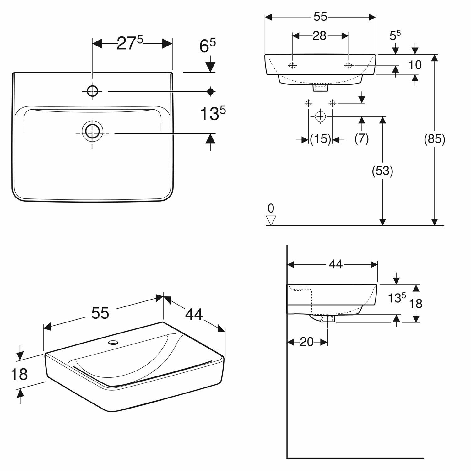 Geberit Renova Plan Waschtisch 55 cm, mit 1 Hahnloch, ohne Überlauf