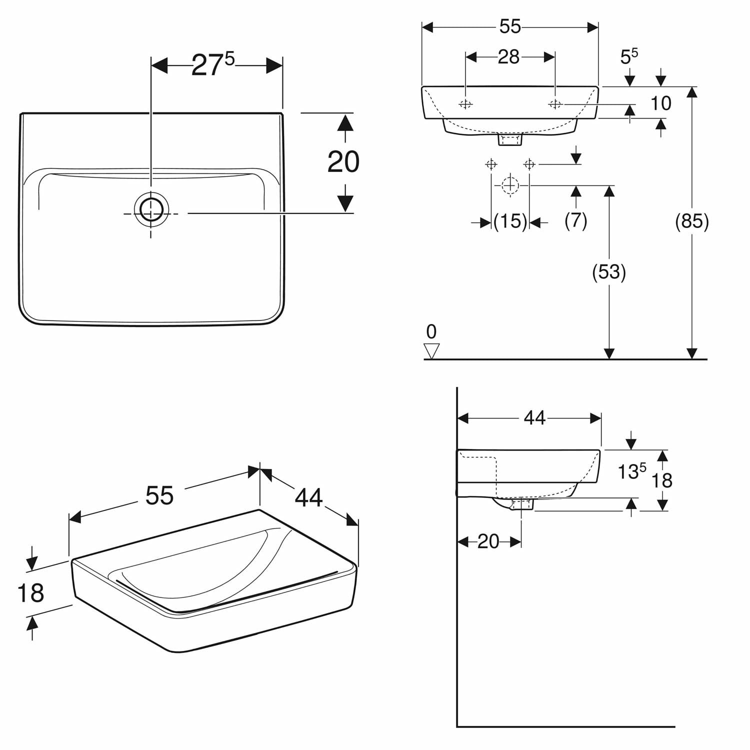 Geberit Renova Plan Waschtisch 55 cm, ohne Hahnloch, ohne Überlauf