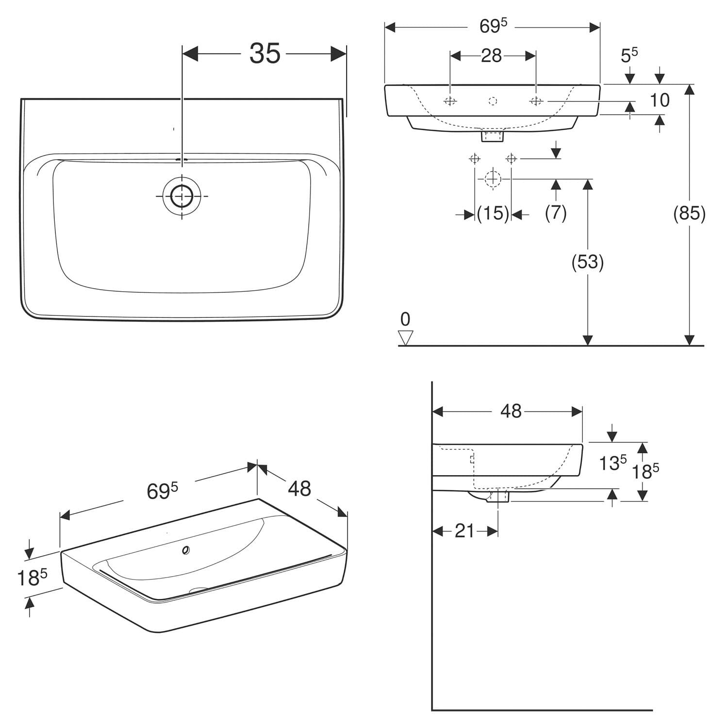 Geberit Renova Plan Waschtisch 70 cm, ohne Hahnloch, mit Überlauf