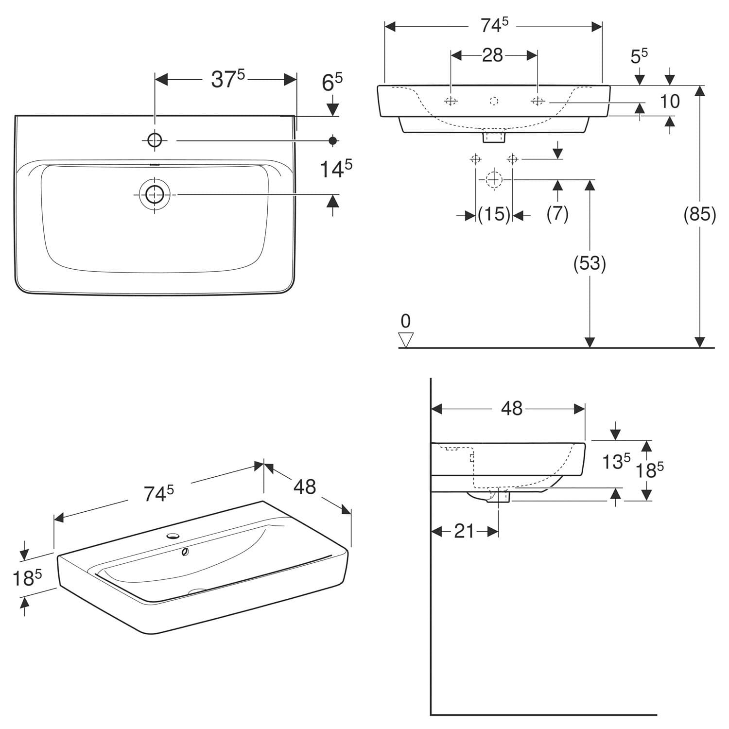 Geberit Renova Plan Waschtisch 75 cm, mit 1 Hahnloch, mit Überlauf
