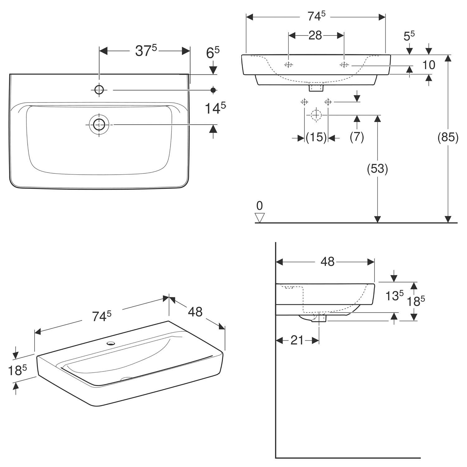 Geberit Renova Plan Waschtisch 75 cm, mit 1 Hahnloch, ohne Überlauf